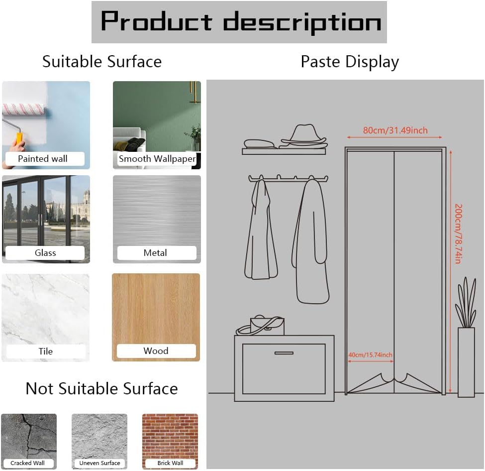 Size — There are two sheets of cut stickers in the package which are 40cm/15.7″ wide and 200cm/78.7″ long, the overall size is 80cmx200cm/31.5″x 78.7″, our size is very standard suitable for all types of door