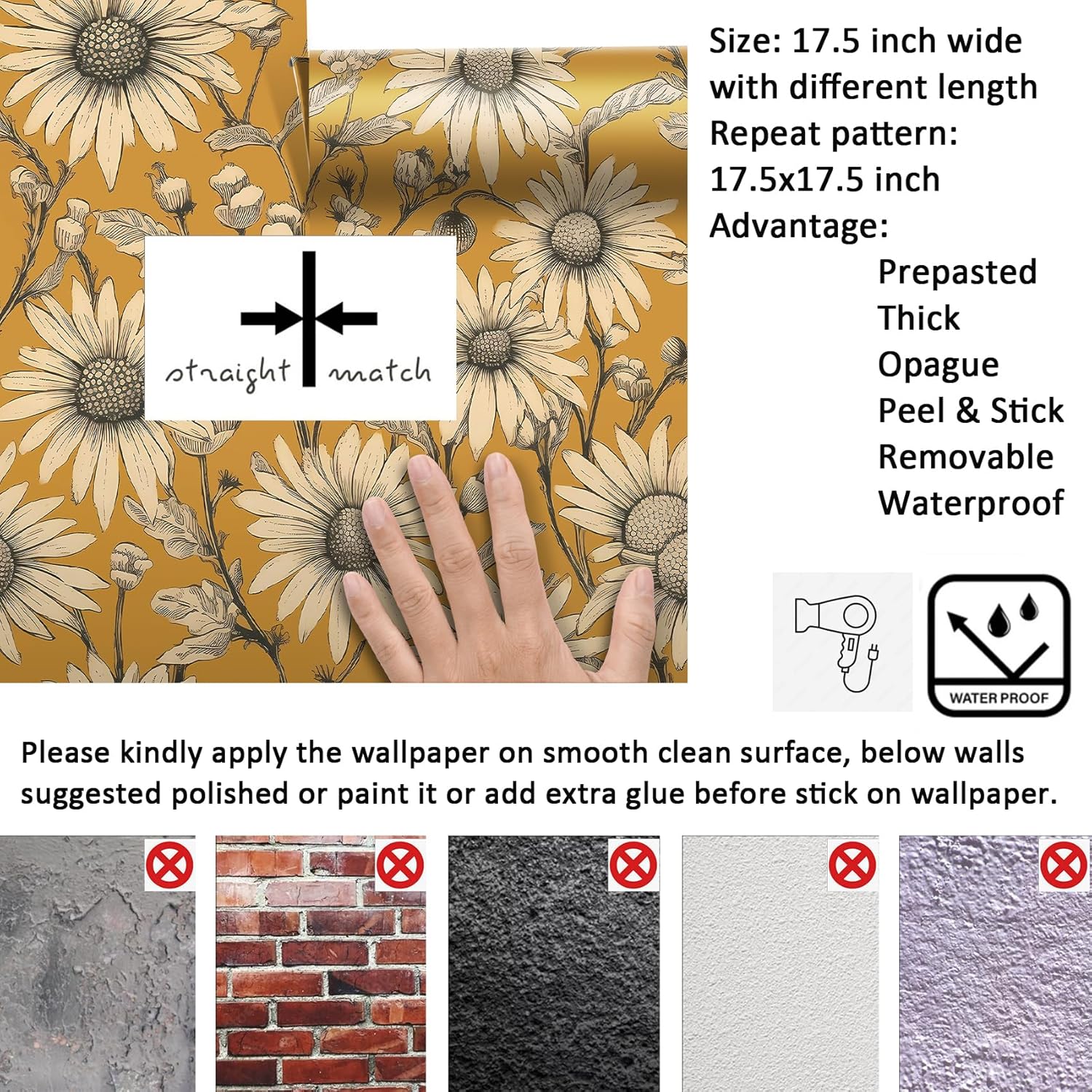 🏠DETAILS: Size 17.5 x78.8 Inch , total 9.57 sq.ft(44.5cmX2m), Self adhesive (no extra glue needed). Made of durable vinyl, Daisy wallpaper, Peel and stick, Matte, Waterproof, Removable.