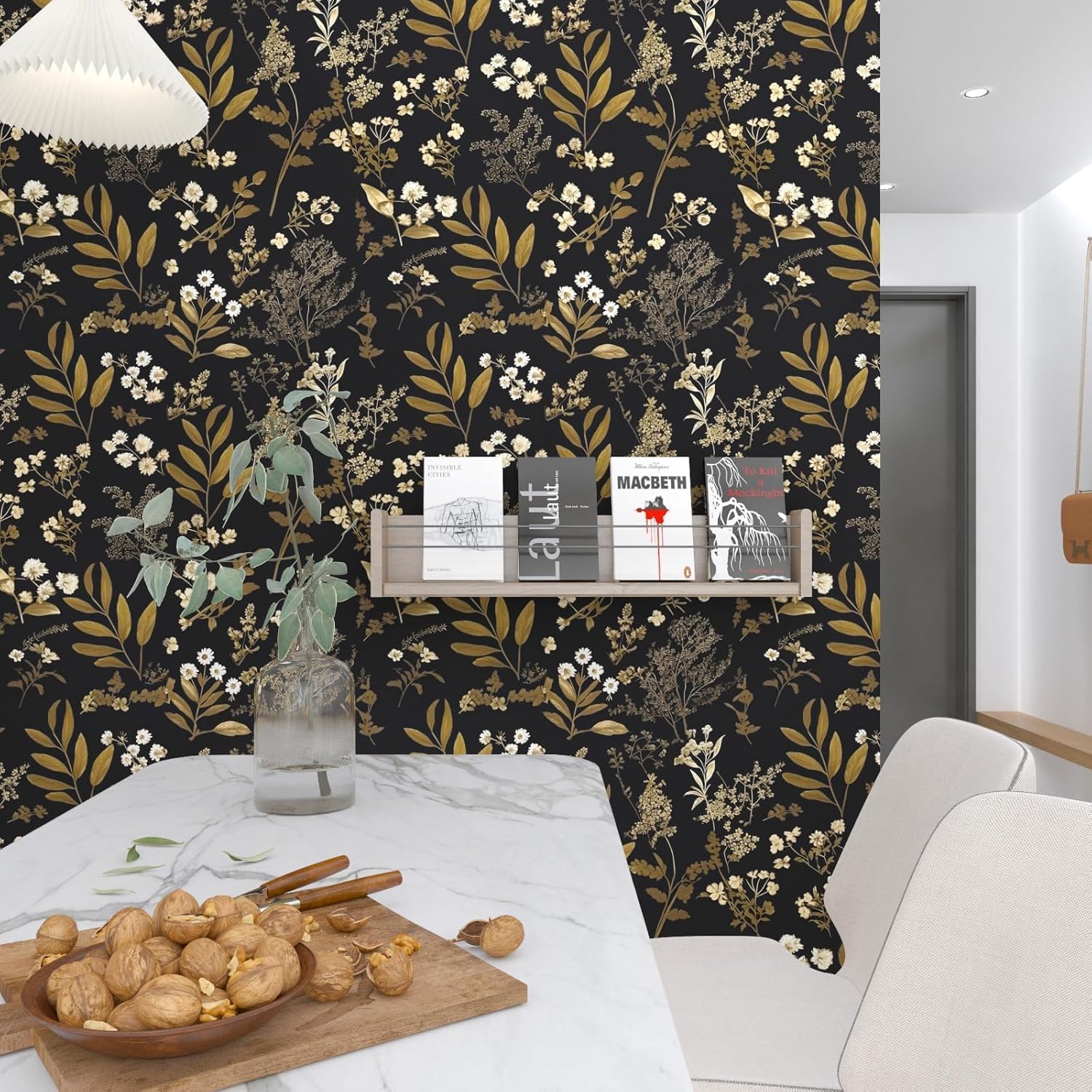 ROLL OF WALLPAPER: Each roll of wallpaper measures 17.5” x 393”, covers 48.5 square feet. Black floral pattern wallpaper that is durable, removable, waterproof, longevity. Please choose enough rolls at a time to ensure they are from the same batch to avoid color differences.