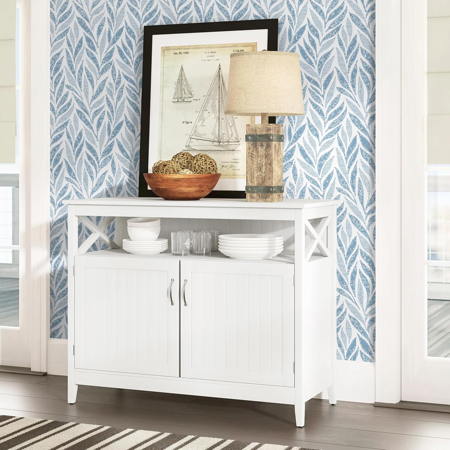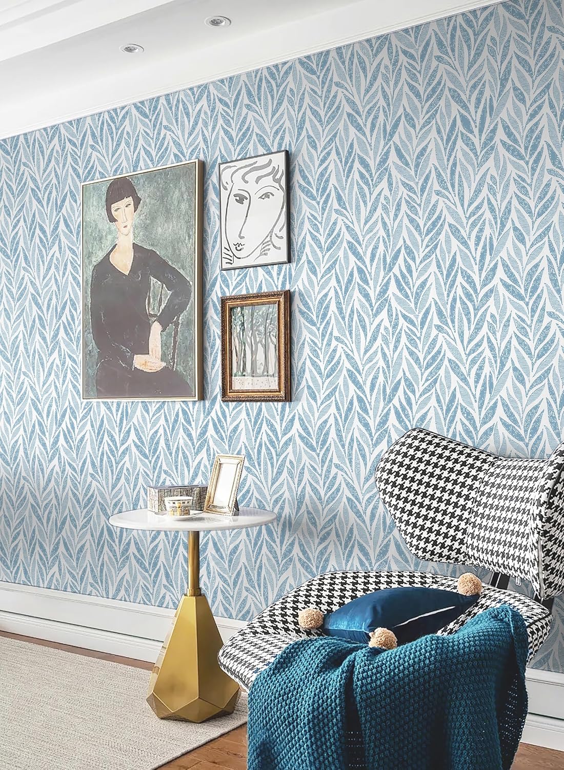 Unique Design: This blue modern peel and stick wallpaper features a charming leaf pattern, with some leaves delicately filled with geometric lines, adding a simple yet elegant touch of natural energy to your home