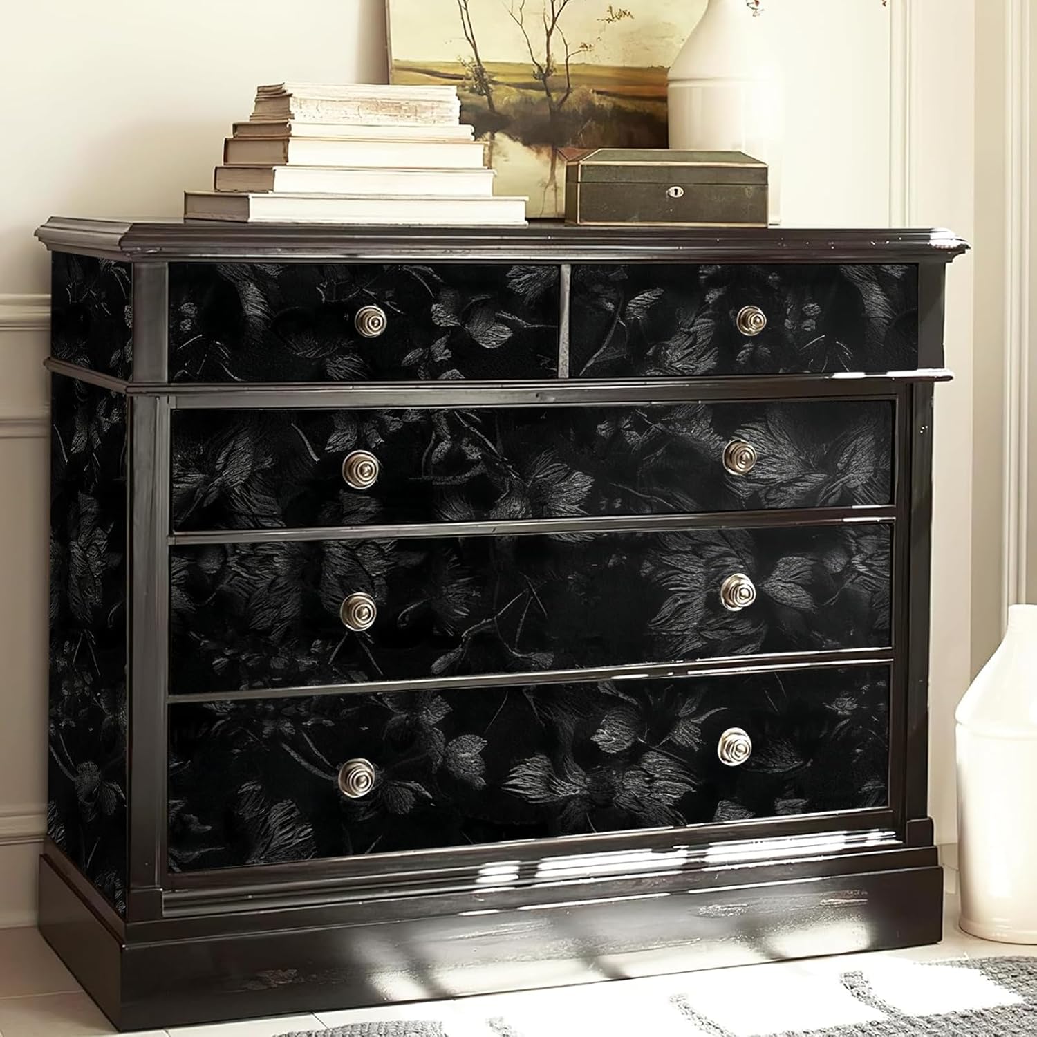 【Multi-functional DIY】This Black embossed floral wallpaper can be used on all kinds of clean and smooth flat surfaces, such as living room, bedroom walls, all kinds of cabinets, closets, bookcases, doors, as well as desktops, drawers and so on. Our black flower contact paper peel and stick has a grid and numbers on the back, which is convenient for you to cut DIY according to the furniture you want to stick.