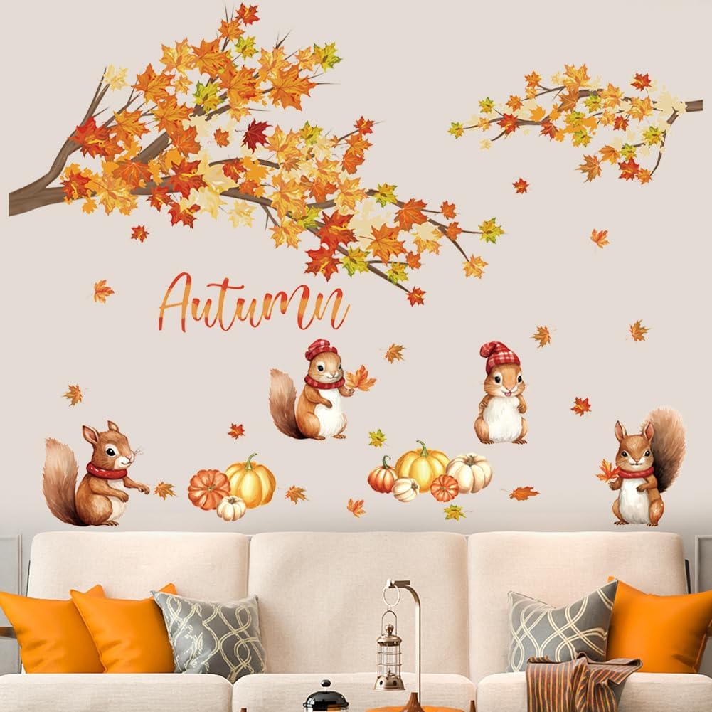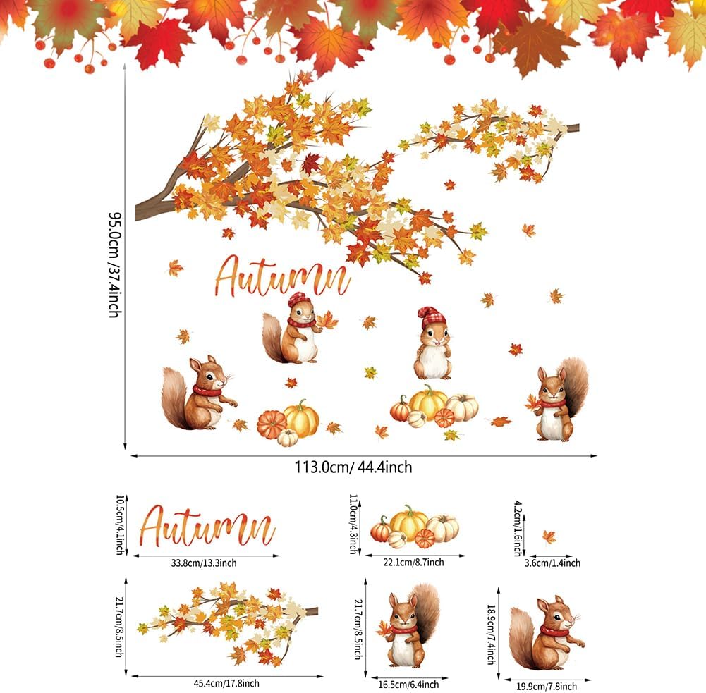Fall Maple Leaves Wall Decals Autumn Squirrel Pumpkins Wall Stickers Thanksgiving Decals Mural for Autumn Holidays Decoration Bedroom Living Room Wall Decor