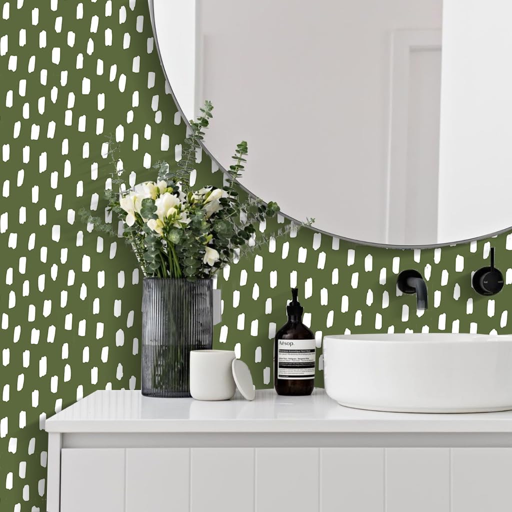 PATTERN & DESIGN: Pattern repeat is H17.7″ x W17.3″ (H45cm x W44cm), straight match. Firstly to find the correct pattern repeat and then just directly match without overlap, it’s very easy for beginner who never did peel and stick wallpaper before. This peel and stick wallpaper featuring a modern design of irregular small dots and stripes. The sage green background with white patterns creates a simple yet stylish look. Ideal for adding a modern and classical touch to any space