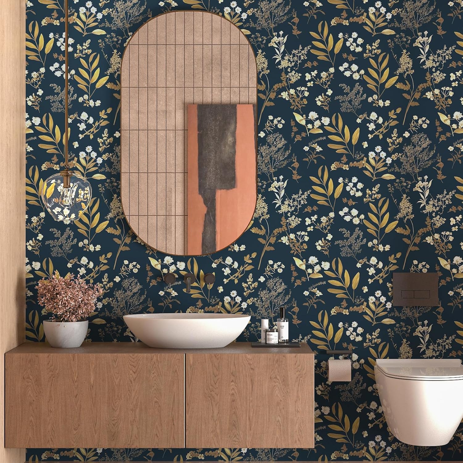 【ROLL OF WALLPAPER】Each roll of wallpaper measures 17.5in x 393in, covers 48.5 square feet. Dark blue floral pattern wallpaper,vinyl,removable,waterproof,self-adhesive.Please buy enough rolls at a time to ensure they are from the same batch to avoid color differences