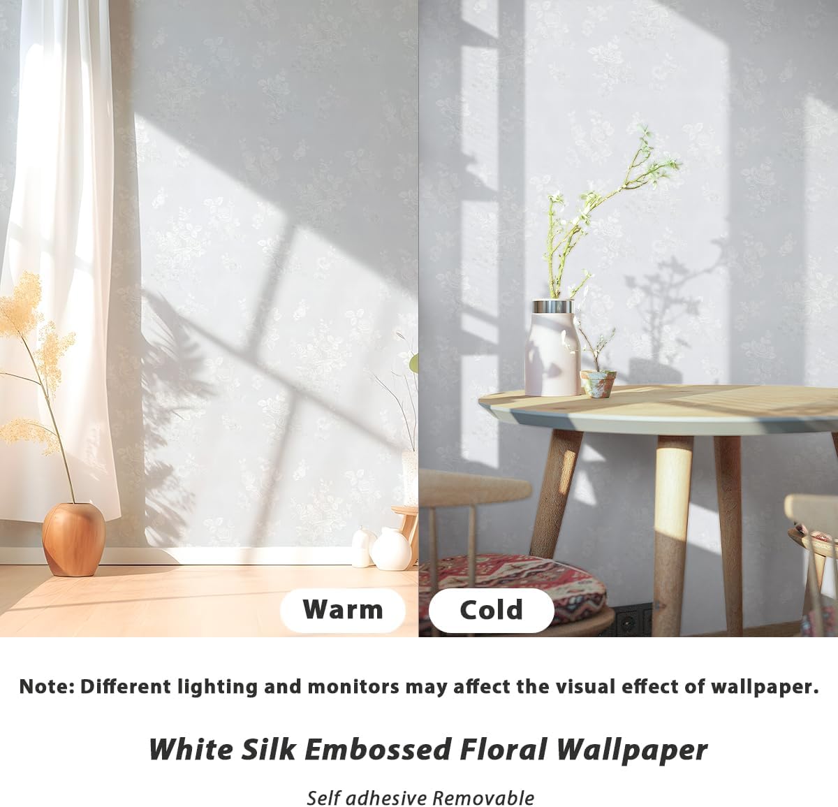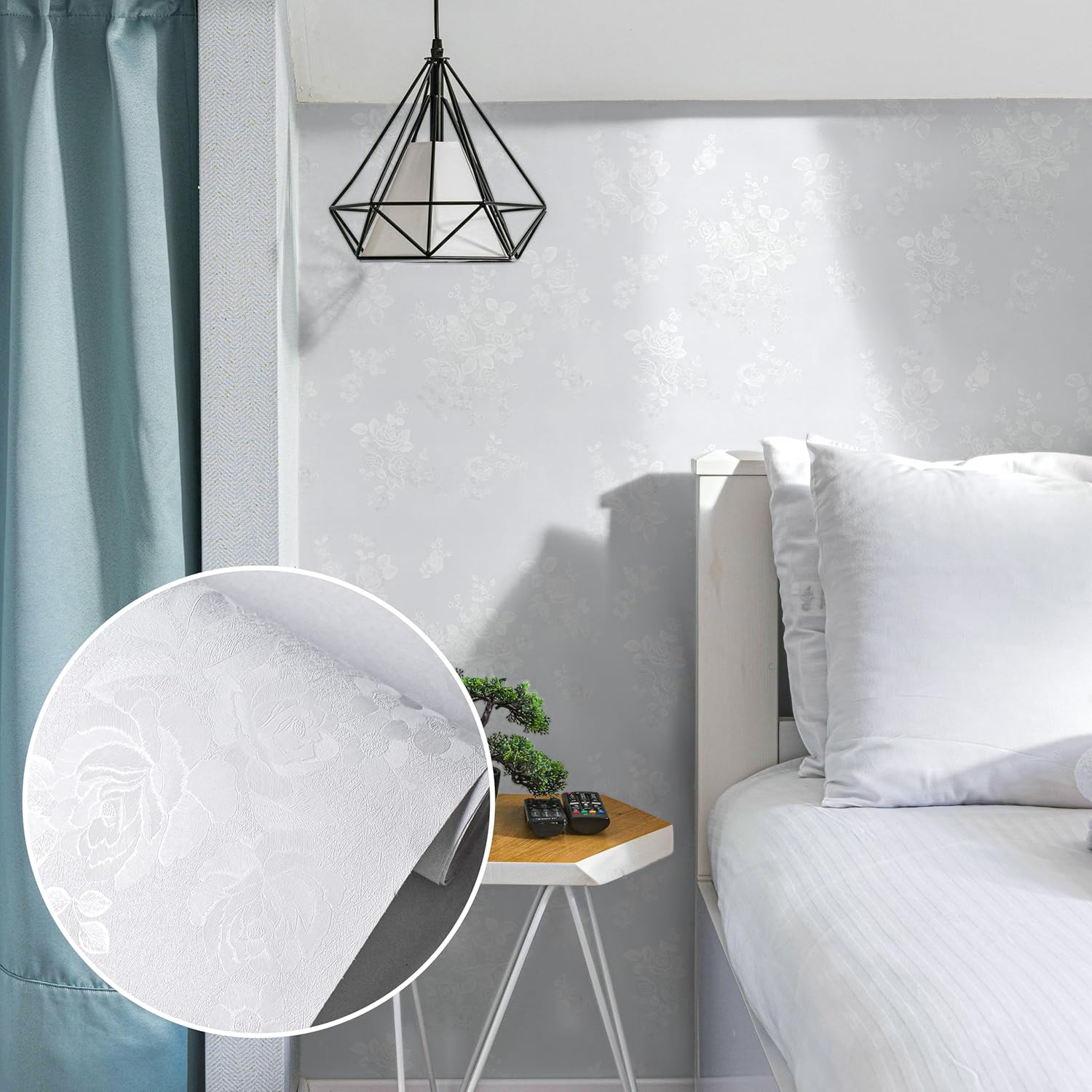 【Silk Embossed Floral Design】: Compared with ordinary white wallpaper, our white wallpaper incorporates silk and embossing elements. Under the light, you can slightly see the flowers on the white wallpaper reflecting silver light, making the wall decoration more advanced and luxurious