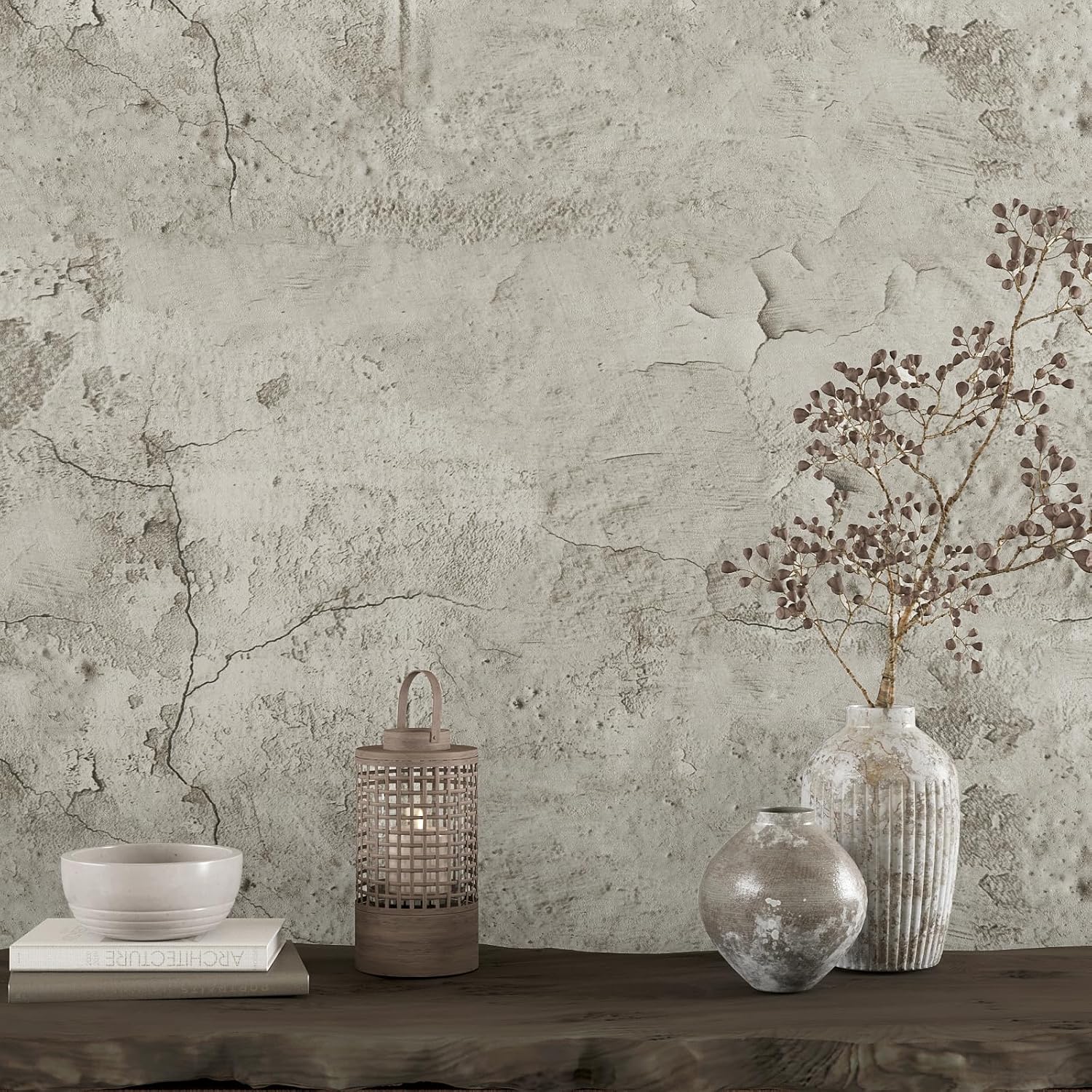 𝐏𝐫𝐨𝐝𝐮𝐜𝐭 𝐃𝐞𝐭𝐚𝐢𝐥𝐬: 15.7 inches wide by 118 inches long, coverage approx. 13 square feet each roll concrete wallpaper. Made of sturdy vinyl, durable, tear resistant, beige color, old cracked concrete look wallpaper