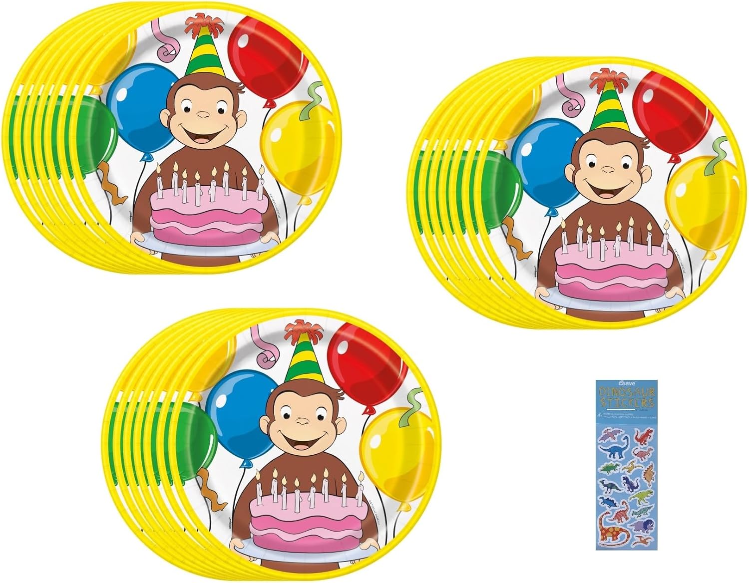 Curious George Birthday Party Supplies Bundle includes 24 Lunch Paper Plates 9″ and 1 Dinosaur Sticker Sheet.