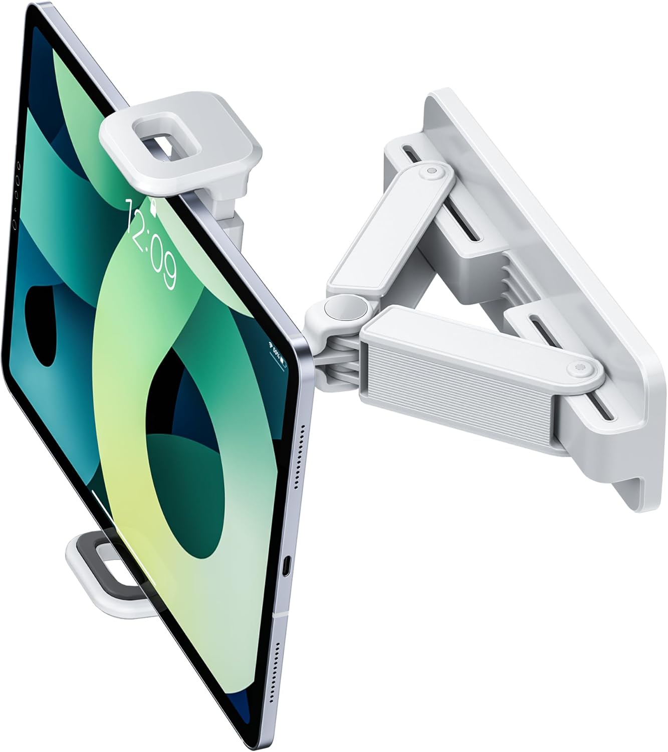 【Multi-Angle Adjustment】360° Swivel ball head & 90° Adjustable connector get you the most Comfortable angle for optimal viewing; Tilt your screen freely to personalize your viewing preference; Slope arms can slide horizontally for tablet position adjustment while fold down to save space when the holder is not in use.