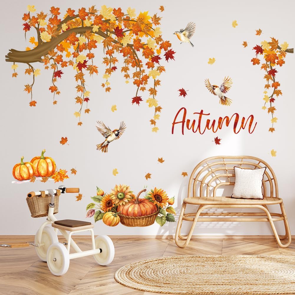 Fall Wall Decals Maple Tree Branch Birds Wall Stickers Autumn Pumpkin Mural Stickers Thanksgiving Harvest Wallpaper Peel and Stick Wall Art Decal for Living Room Bedroom