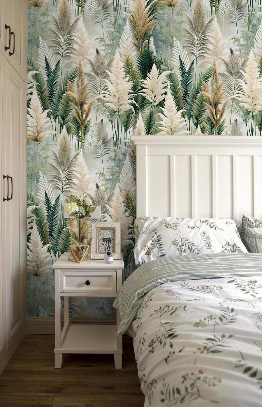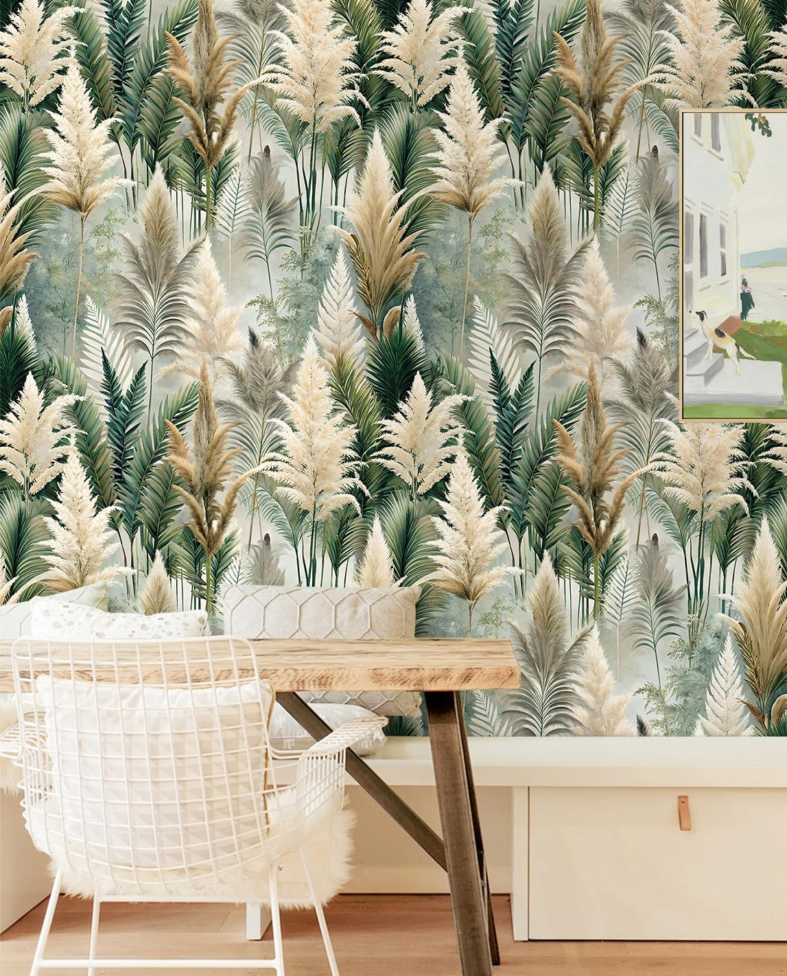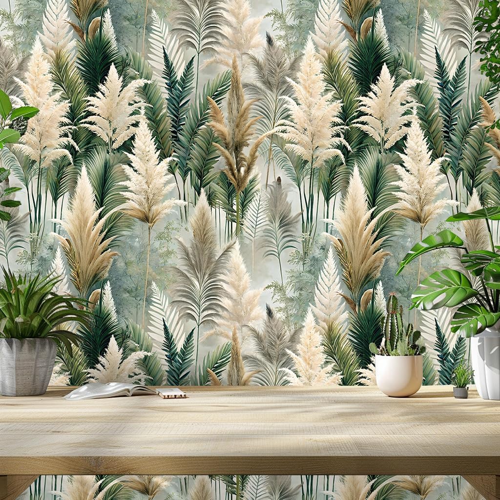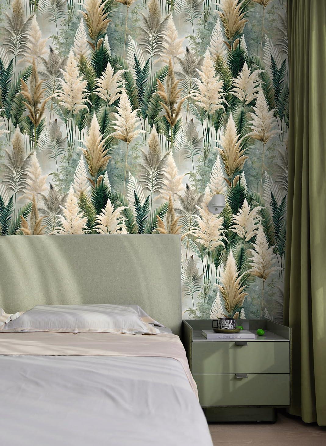 Design: What a stunning reed leaves peel and stick wallpaper! Light beige, dark green and gray reeds rising elegantly amidst the mist, creating a sense of movement and natural beauty. The colors and misty elements bring a calming ambiance. Whether in a bedroom, living room, or study, it adds a touch of timeless elegance and a peaceful