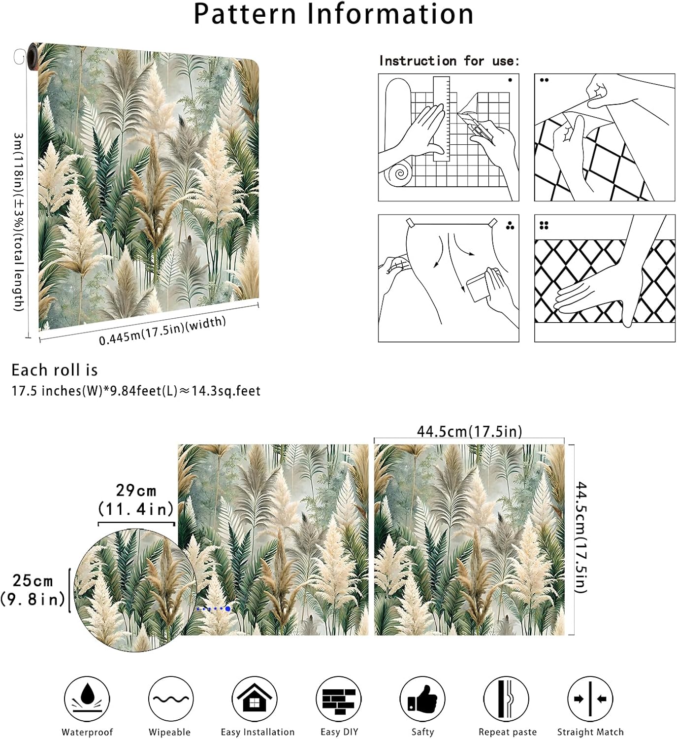 Color: Green/Beige/GrayMaterial: Vinyl Self Adhesive WallpaperRoll Size: 1.45ft(W) x 9.8ft(L)=14.3sq.ftDesign repeat: W17.5″ x H17.5″(W44.5cm x H44.5cm), Straight Match