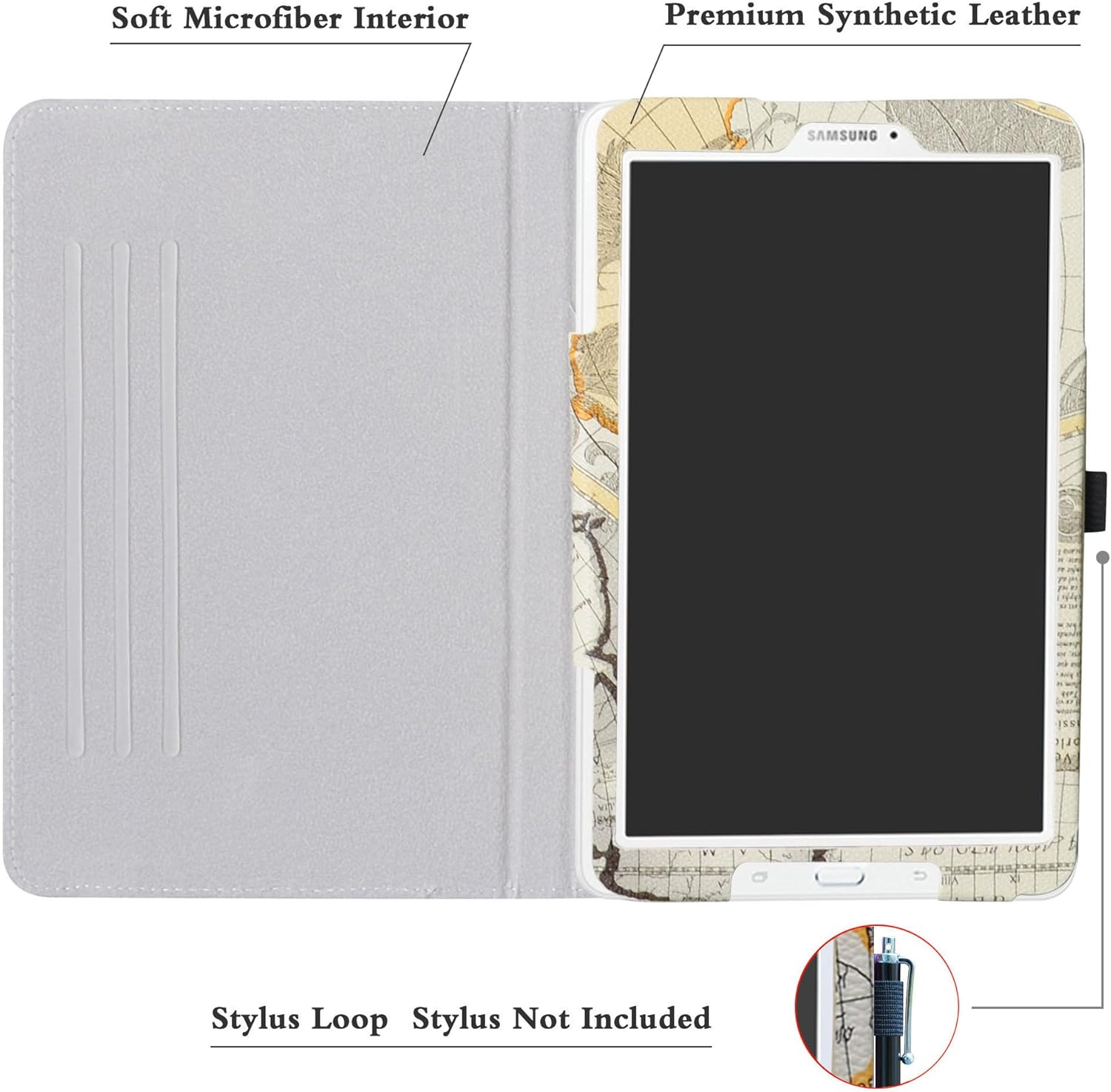 Made of synthetic material leather,Magnetic closure and Stylus loop