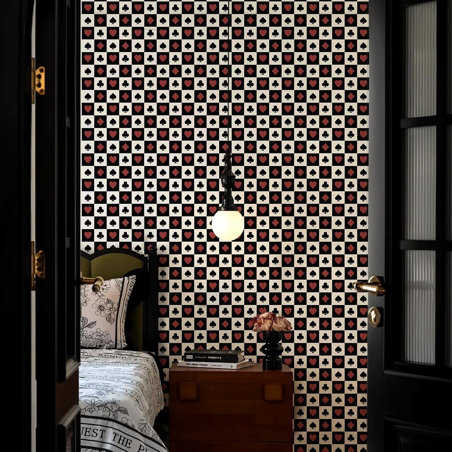 【Size & Details】:The size of the checkered peel and stick wallpaper is 17.3×120 inches, which can cover approximately 14.1 square feet. Black red playing cards wallpaper is made of vinyl material, waterproof, oil proof, easy to stick, easy to remove,and tenant friendly