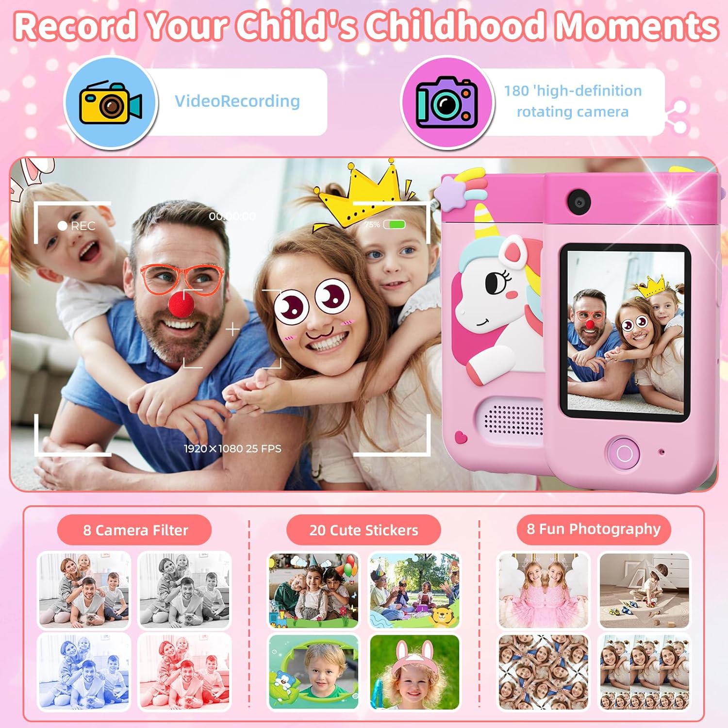 【Newly upgraded kids smart phone 2.0】 kids phones support 180° HD rotating camera,8MP take photo and 1080P HD video recording, Just rotate the lens 180° to quickly switch between taking photos and taking selfies. With 28 Funny Filters and cute stickers. Kids choose their favorite stickers to take photos and record the beautiful moments and interesting experiences in their lives with family or friends. To prevent the loss, kids phone for girls boys comes with a durable lanyard for easy carrying