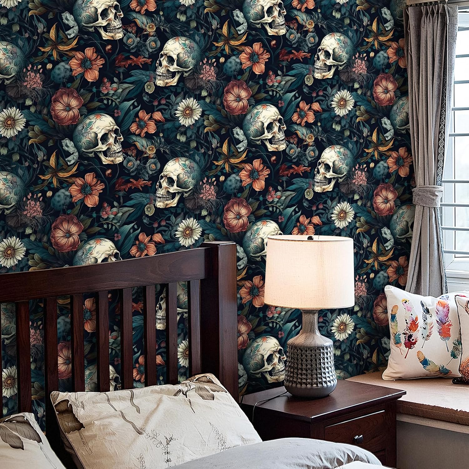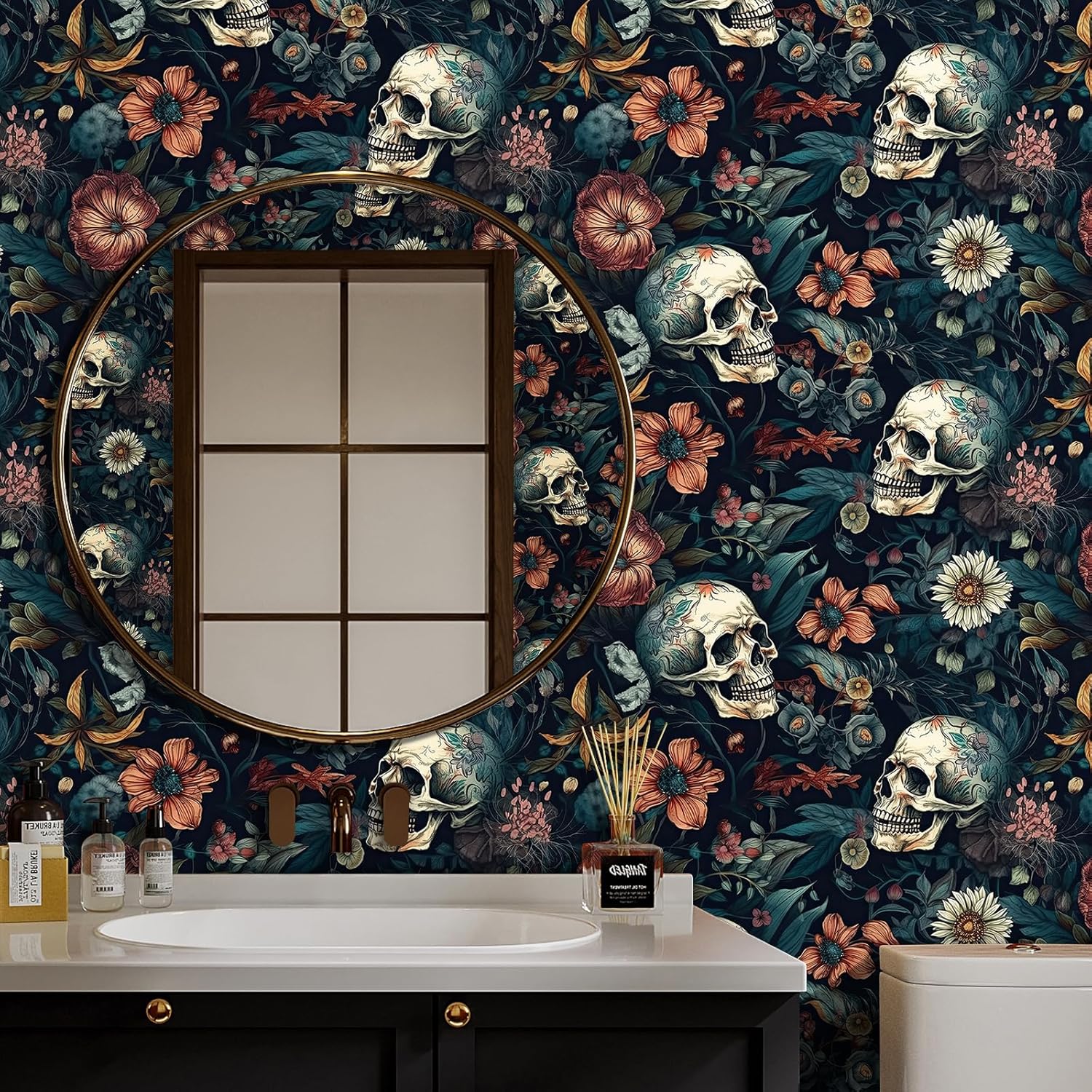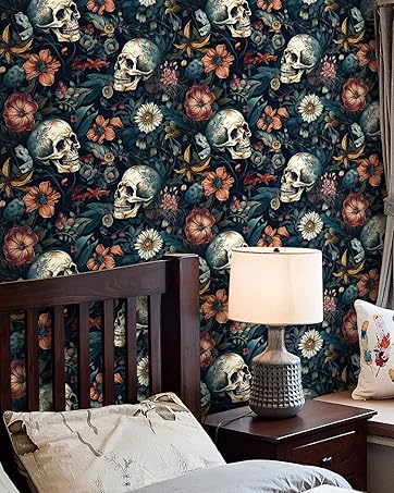 🎃𝐒𝐤𝐮𝐥𝐥 𝐅𝐥𝐨𝐫𝐚𝐥 𝐖𝐚𝐥𝐥𝐩𝐚𝐩𝐞𝐫: Durable vinyl beige dark blue skull wallpaper stick and peel. Waterproof, moisture-proof, tear-resistant and easy to clean. Super easy to install, just peel and stick! The gridlines on the back of vintage orange floral wallpaper can make you measure and cut easily, forgiving for beginner.