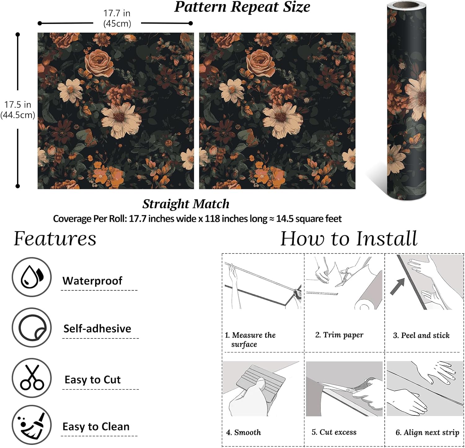 Material Vinyl Size 17.7” Wide x 118” Long Coverage 14.5 Sq.Ft. Pattern Match straight Match Key Features self adhesive, peel and stick, repositionable, removable, renter-friendly, water-resistant Style vintage wallpaper, floral wallpaper Color dark, orange Wide Application bedroom, bathroom, living room, powder room, kitchen, dining room, dollhouse, girl’s room, pantry areas, hallway, nursery, rentals, walls, cabinets, furniture, shelves, drawer liners, cupboard, bookshelves, dresser, closet, table, accent wall, diy projects