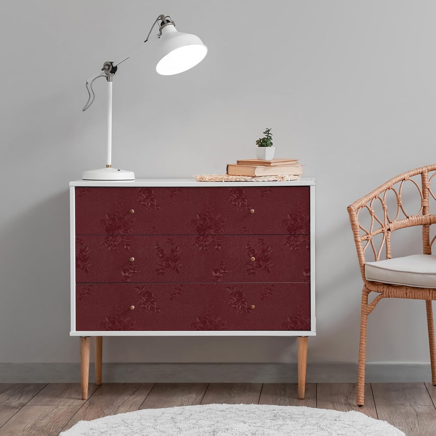 Dark Red Floral Wallpaper: Ideal for any smooth flat surface, this wallpaper can be applied to cabinets, countertops, shelf liners, walls, furniture, kitchen backsplashes, bookcases, tables, desks, dressers, nightstands, drawers and doors