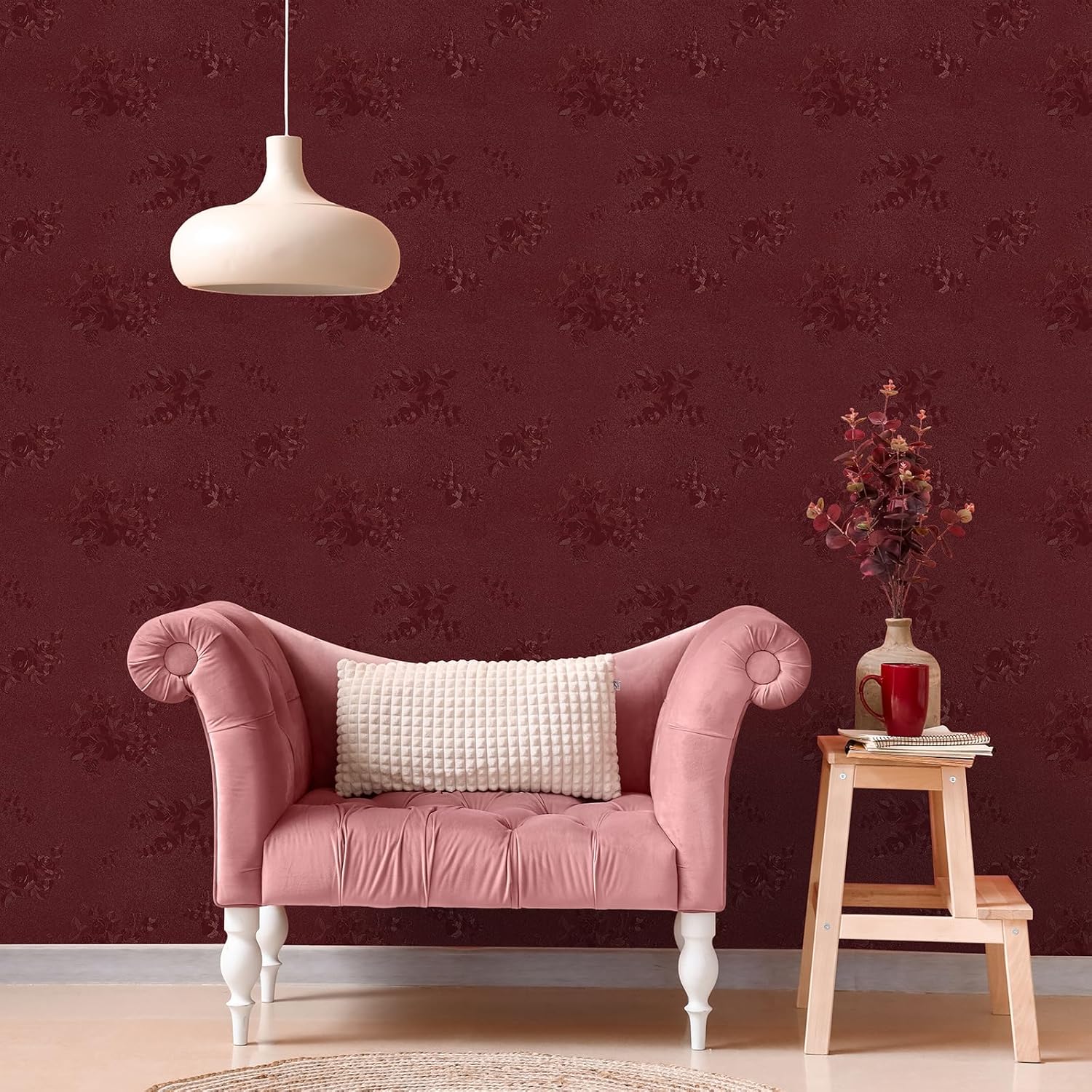 Dark Red Floral Wallpaper: The solid pure wallpaper series showcases a double textured design with an embossed matte background and glossy floral details, bringing understated elegance and charm to any space. One roll of dark red wallpaper measures 12 inches by 100 inches and covers 8.39 square feet