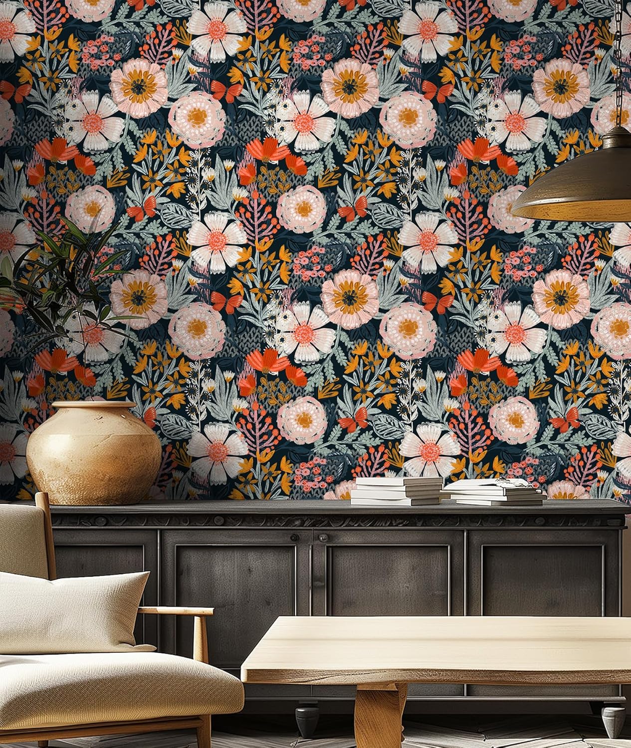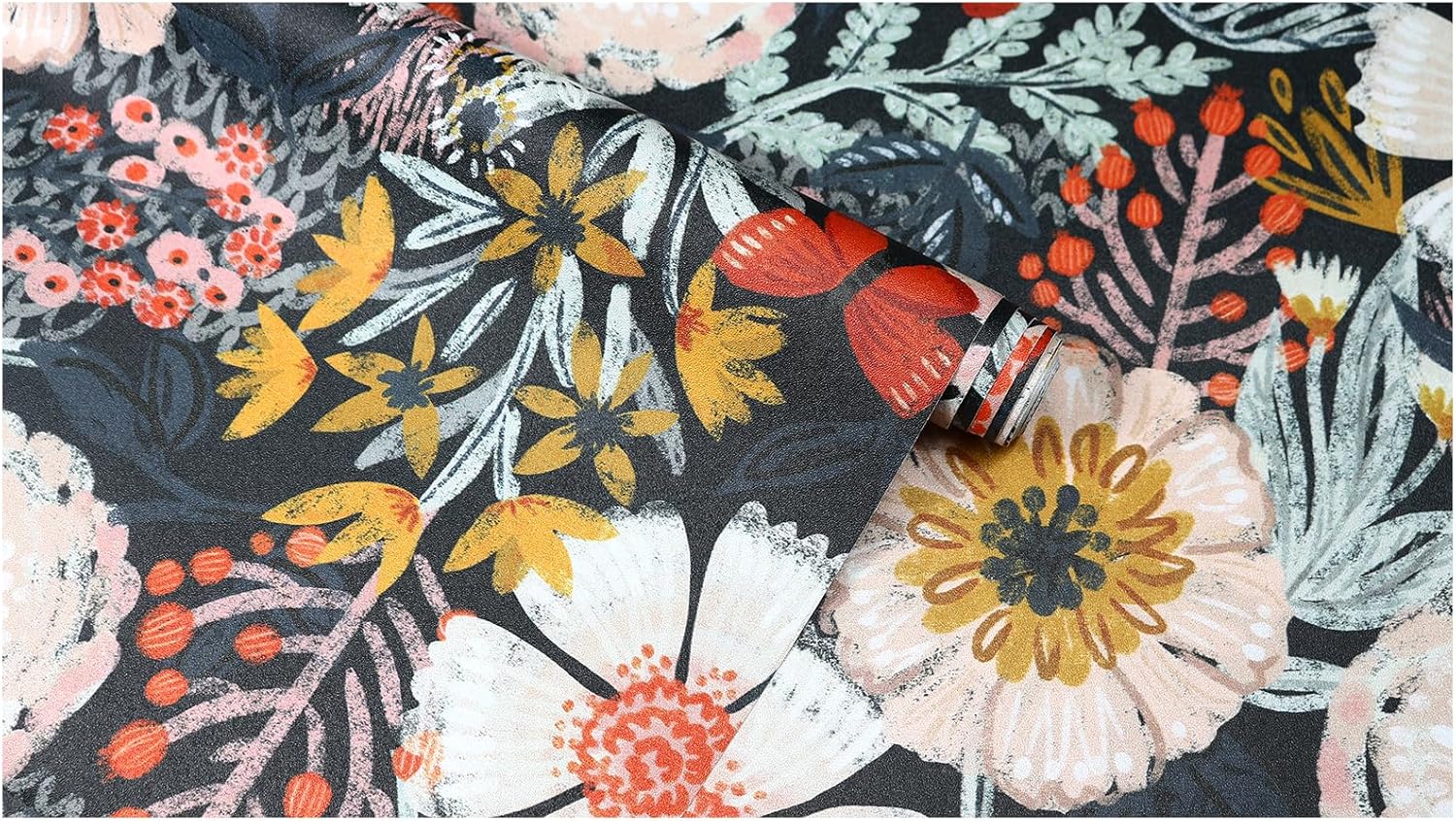PATTERN & DESIGN: Pattern repeat is H17.7″ x W17.7″ (H45cm x W45cm), straight match. Firstly to find the correct pattern repeat and then just directly match without overlap, it’s very easy for beginner who never did peel and stick wallpaper before. The peel and stick wallpaper features an abstract pattern of flowers and plants. Its designs a deep blue base color, with large pale pinkish flowers, small orange and coral flowers, as well as turquoise leaves. Whether you’re looking to add a pop of color or create a cozy and inviting atmosphere, a boho ethnic style wallpaper with large floral, dark, and bold colors is a great choice.