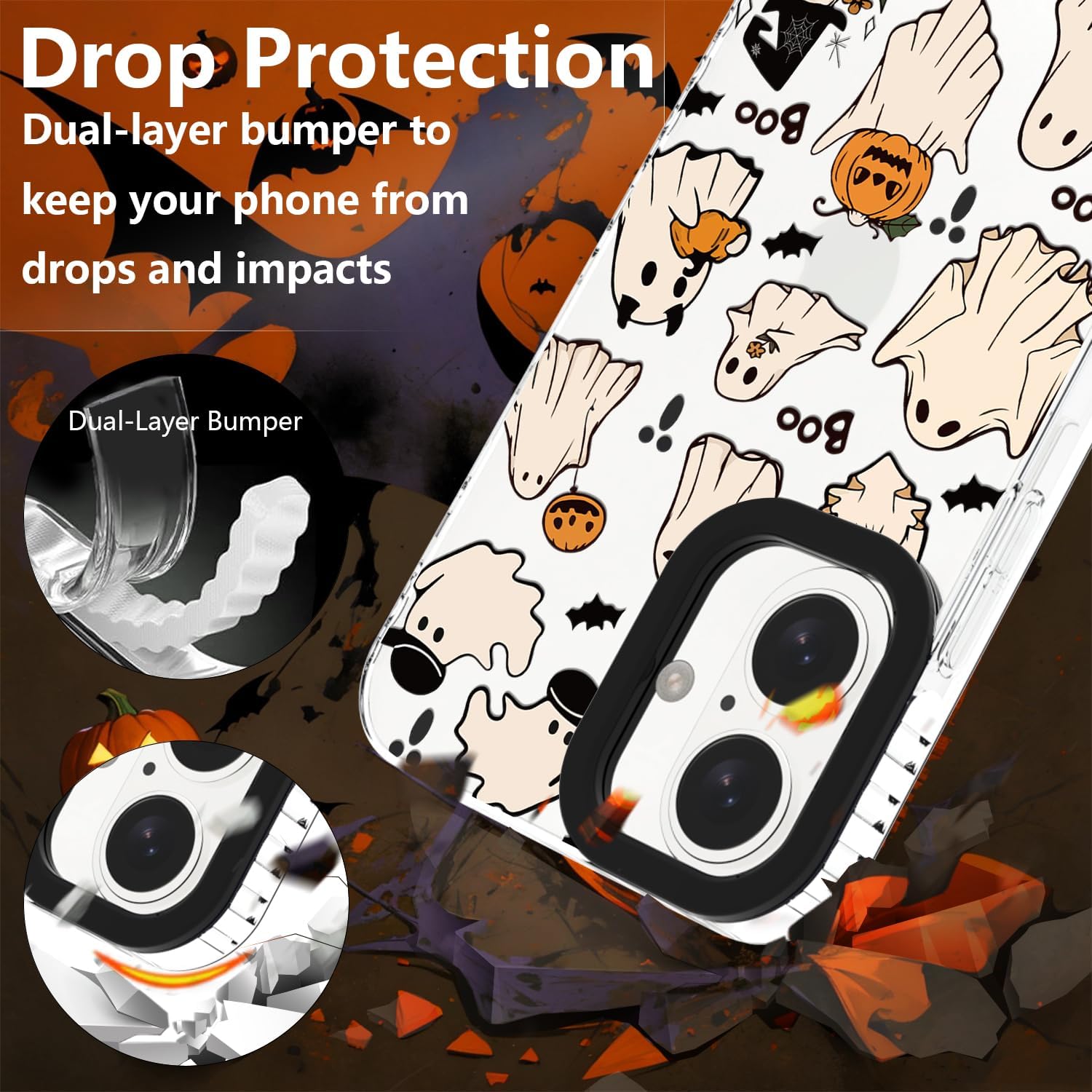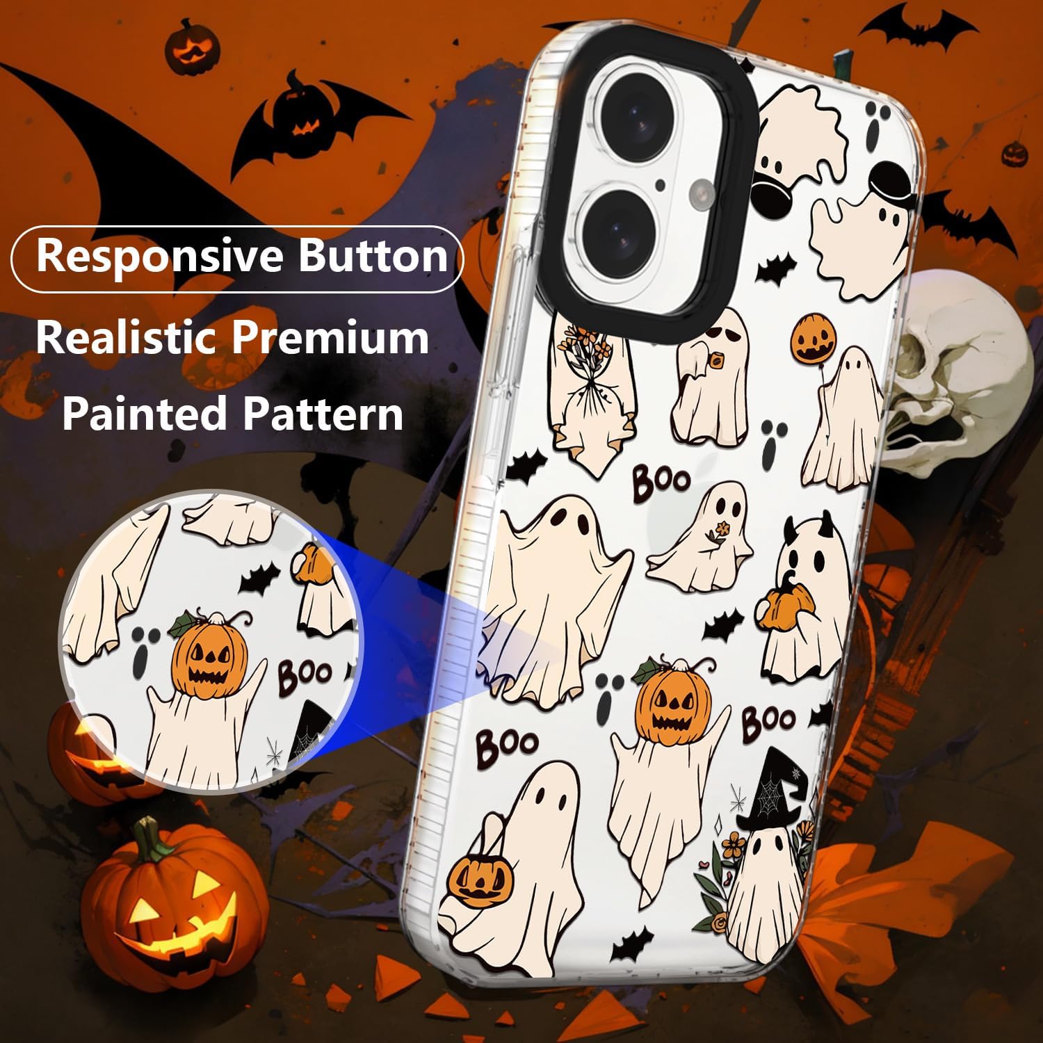 SCRATCH-RESISTENT PROTECTION : The halloween ghost phone case raised edges keep screen and camera lifted to prevent surface scratches.The side interior has white anti slip texture, which can enhance the anti slip effect of the phone
