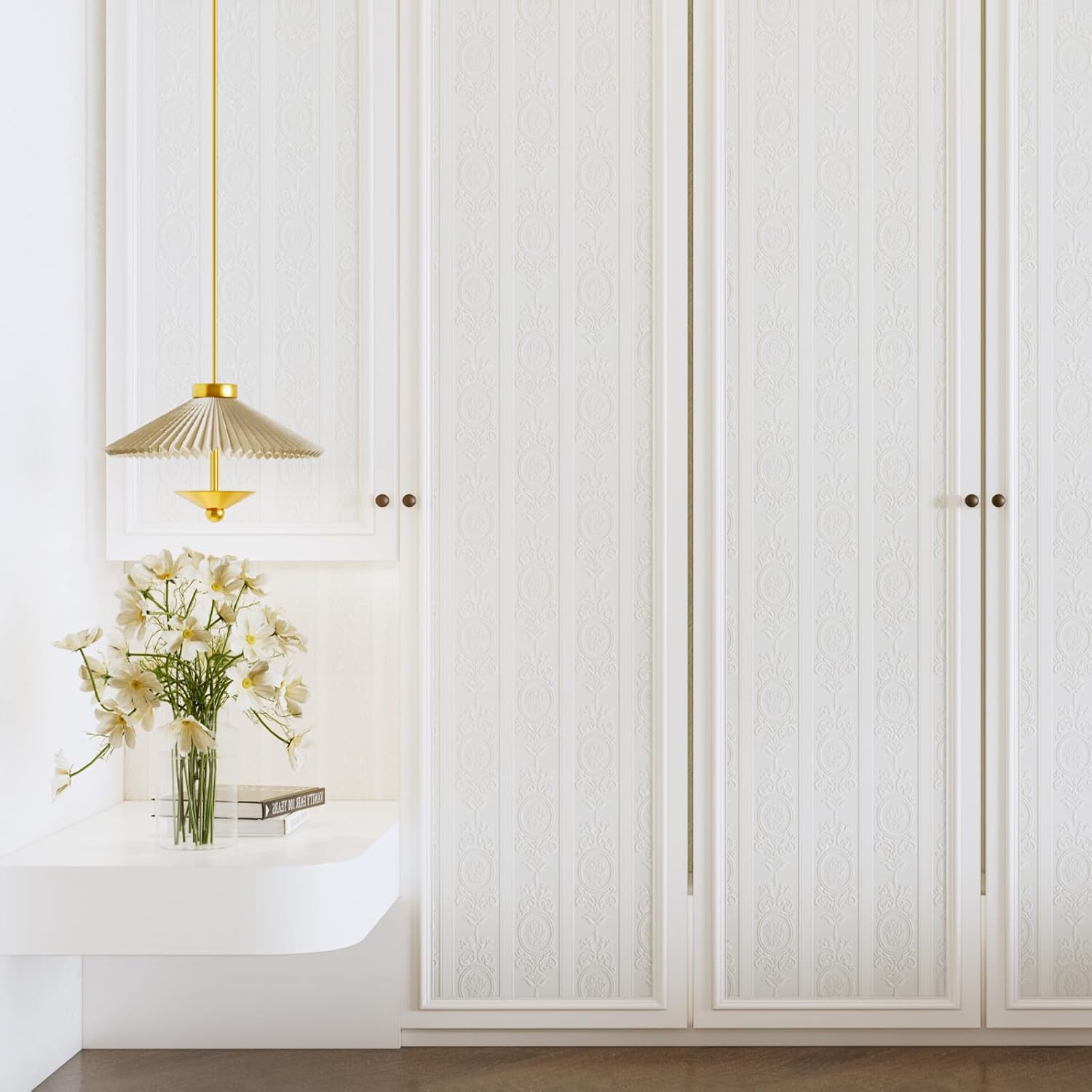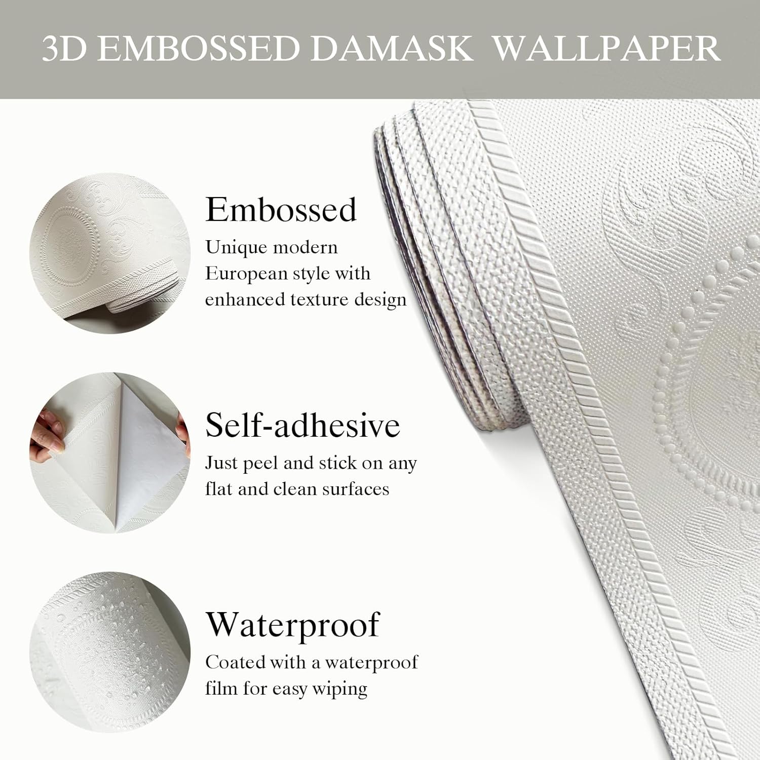 Unique Design:This peel stick wallpaper features 3D Embossed floral and geometric,of modern European Style.Will create a minimalist and high-class atmosphere.Suitable for residential and commercial interior DIY decoration(Note:Our wallpaper about 0.5mm,more than twice as thick as others.Wrinkles are normal after rolling due to the thicker fabric,will flatten out after installation)