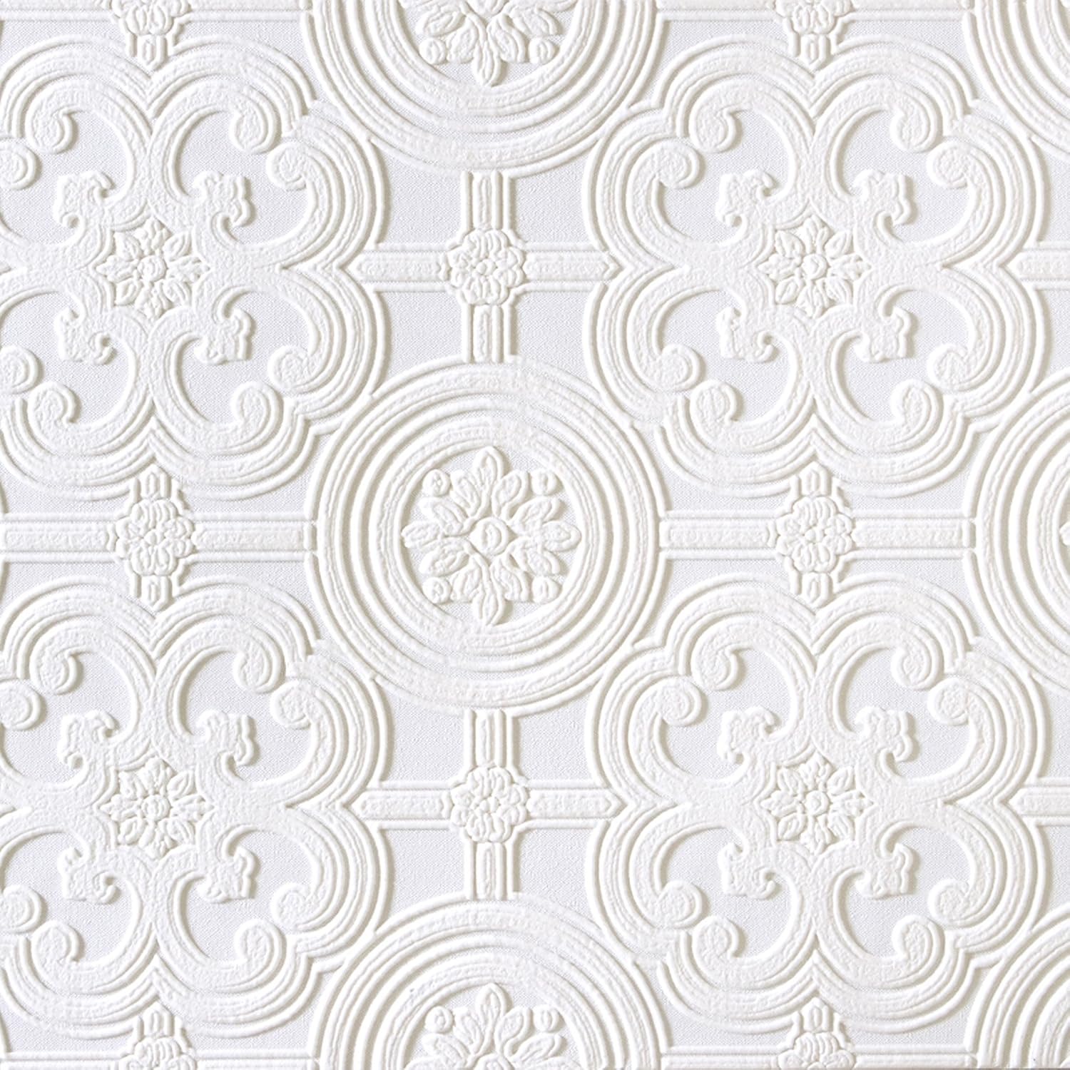 With baroque style influence, this decorative tile design flourishes impressive detail on walls. Designed with a bold architectural finish, this paintable wall paper can be easily customized with the paint color of your choice or enjoyed as is in clean white.