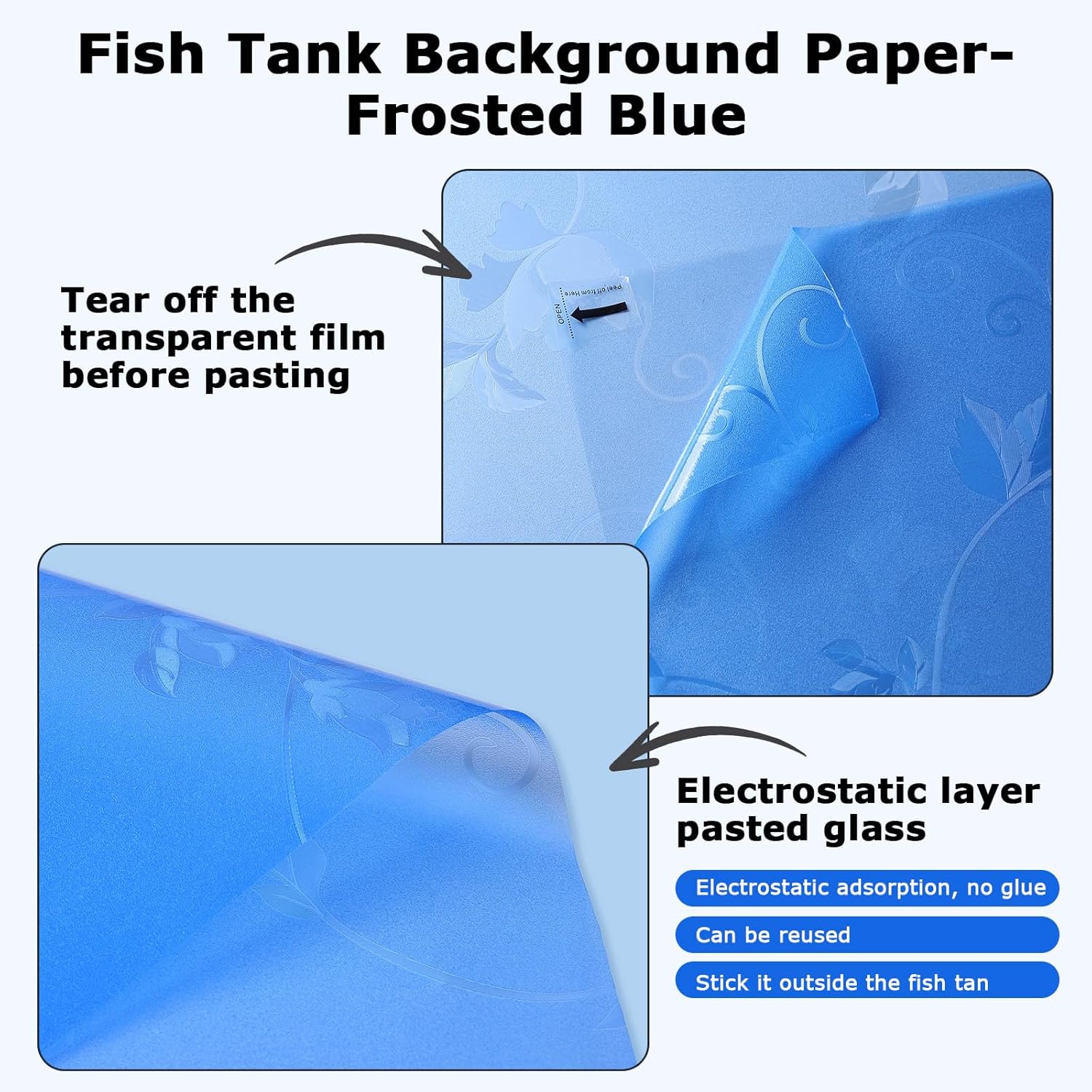 [ Tips ] In order to stick the aquarium wallpaper well without bubbles and firmly adhere to the fish tank background, we strongly recommend that you follow our steps. Here are some useful suggestions: Add 1 drop of detergent to about 500 ml of water, then spray the soapy water evenly on the fish tank background and the fish tank wallpaper at intervals of about 15 cm, making sure there is no dust, and finally use the scraper provided to scrape off excess bubbles and water. If it doesn’t stick well, don’t worry, you can try it again and again.