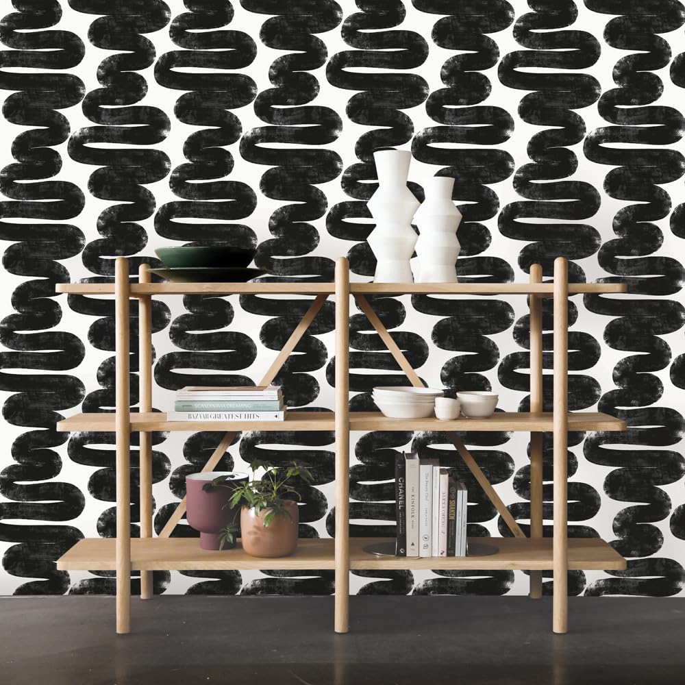 BEAUTIFUL DESIGN: This removable wallpaper by Bobby Berk features bold brushstrokes in a black-and-white colorway, bringing movement to mid-century modern interiors.