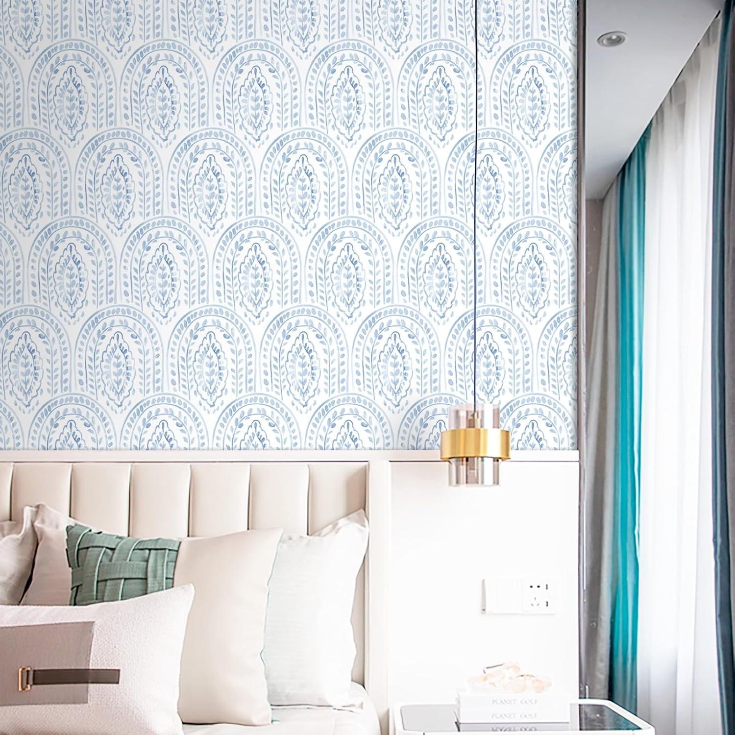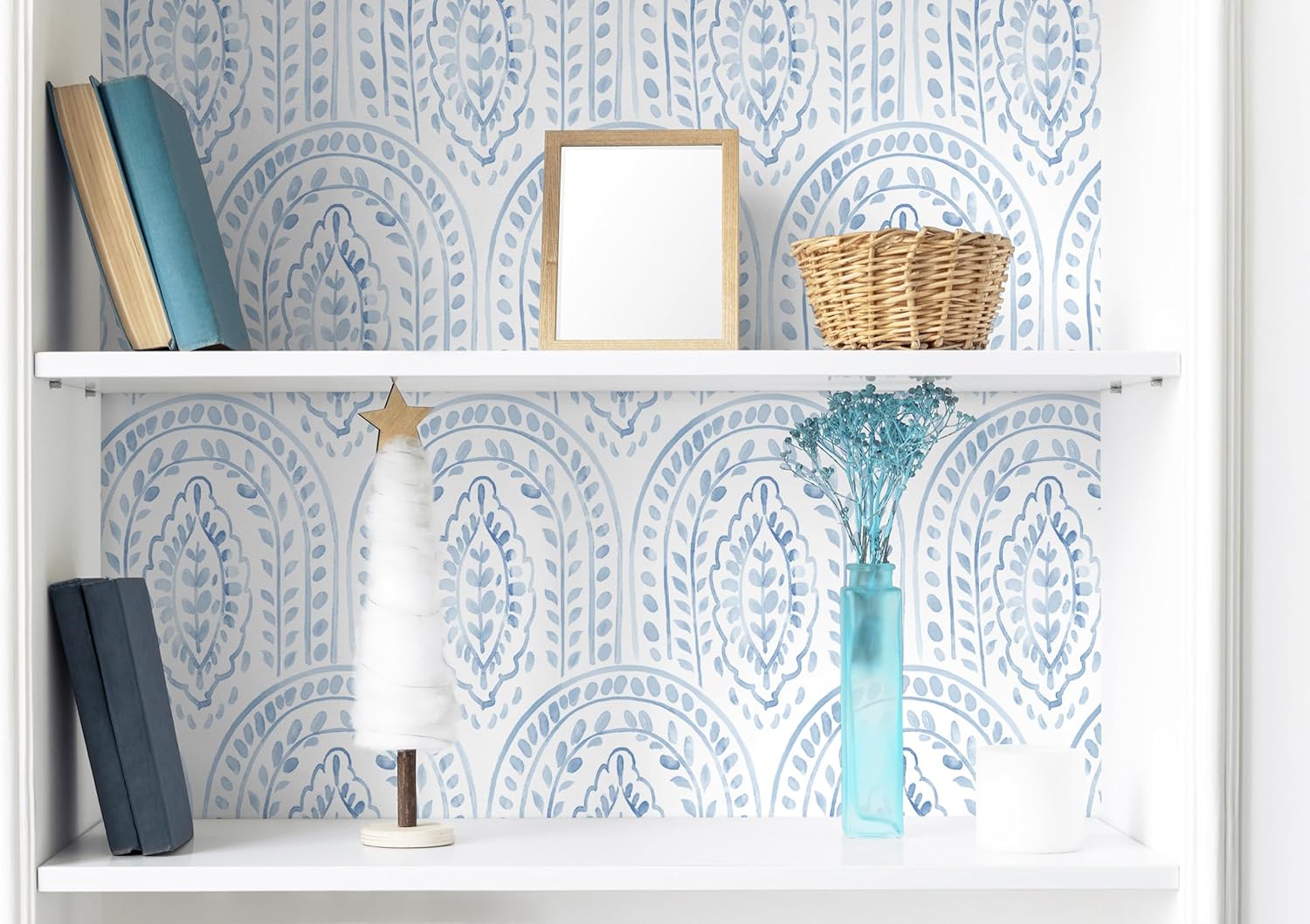 DESIGN: Our boho peel and stick wallpaper uses geometric elements of leaves and arches, which are skillfully matched with the blue color to bring you an elegant and warm atmosphere. SIZE: 17.3”X118.1”. This vinyl wallpaper has a textured surface with a matte design, giving you a higher quality and more rigorous detailing