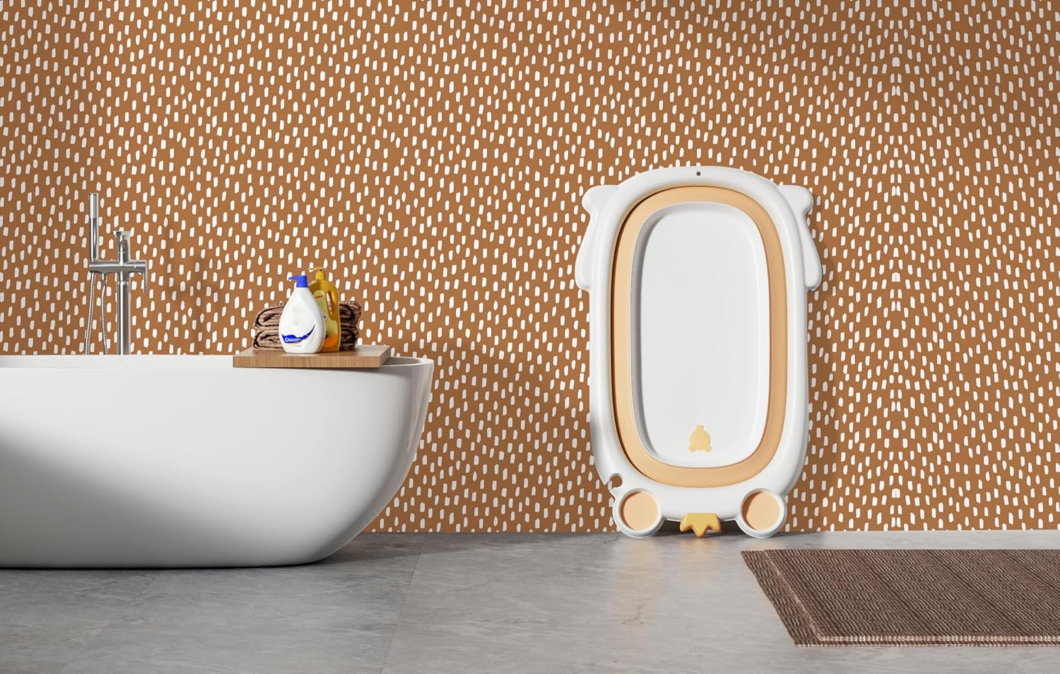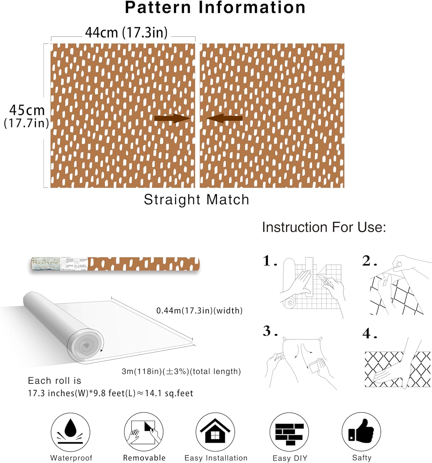 PATTERN & DESIGN: Pattern repeat is H17.7″ x W17.3″ (H45cm x W44cm), straight match. Firstly to find the correct pattern repeat and then just directly match without overlap, it’s very easy for beginner who never did peel and stick wallpaper before. This peel and stick wallpaper featuring a modern design of irregular small dots and stripes. The Caramel background with white patterns creates a simple yet stylish look. Ideal for adding a modern and classical touch to any space.