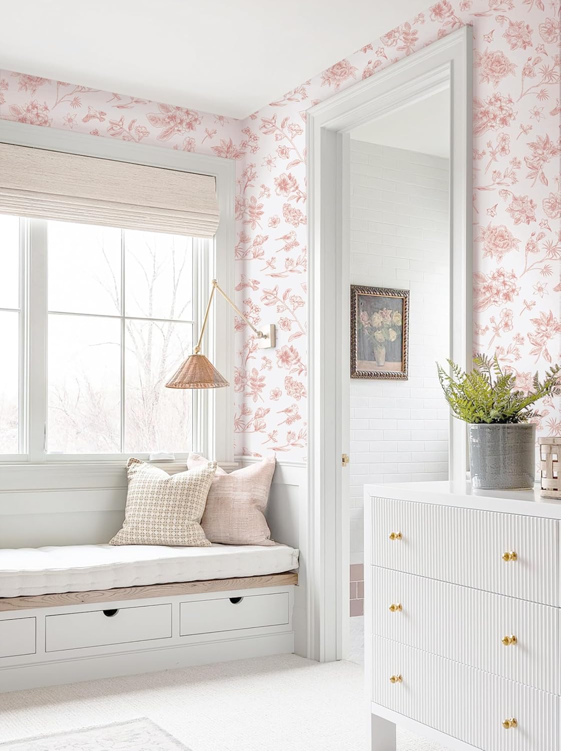 Unique Design: Crafted with meticulous line art, this exquisite wallpaper depicts flowers and adorable birds. The pink lines against the creamy white background bring a warm and comfortable atmosphere to the home decoration