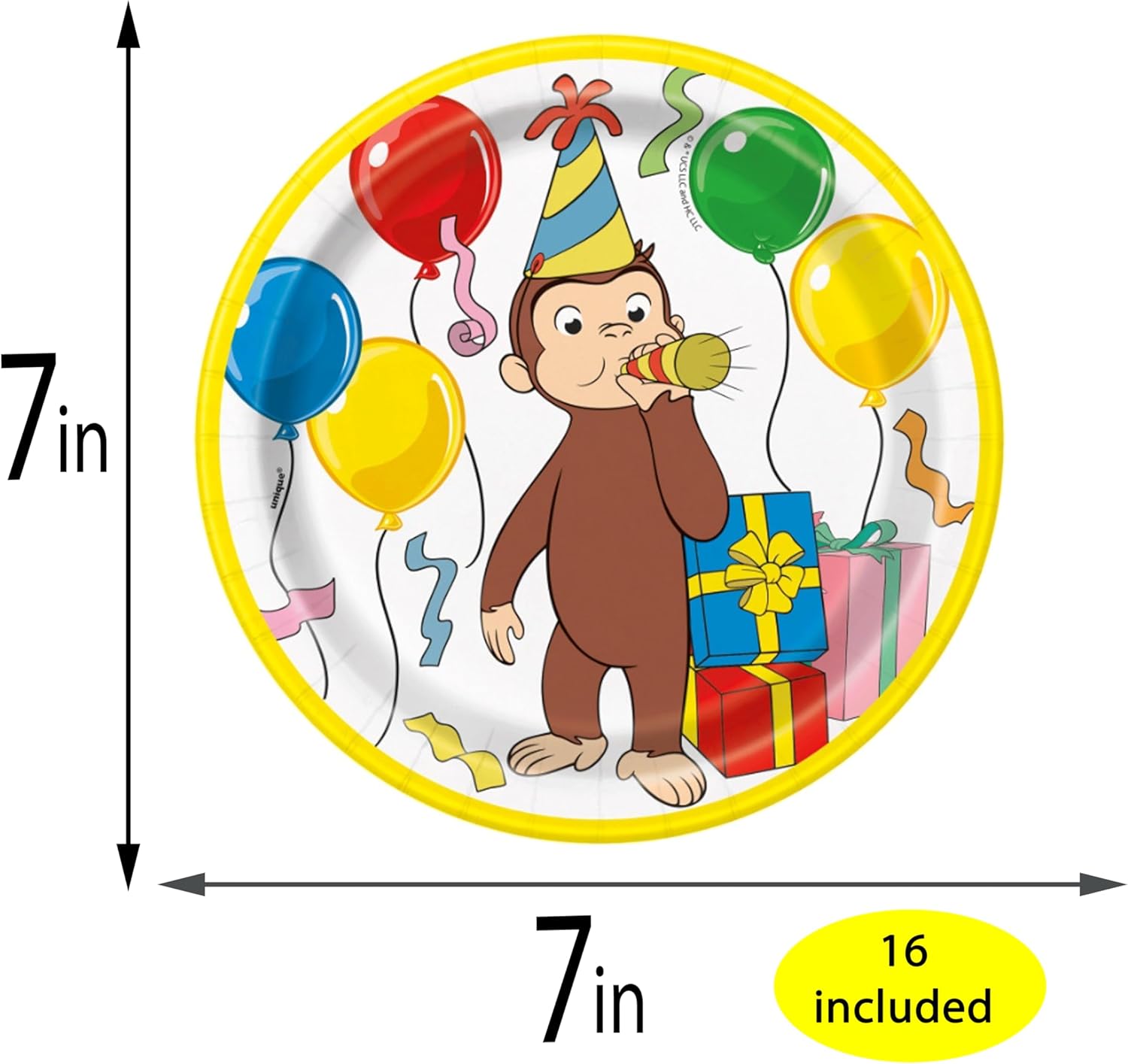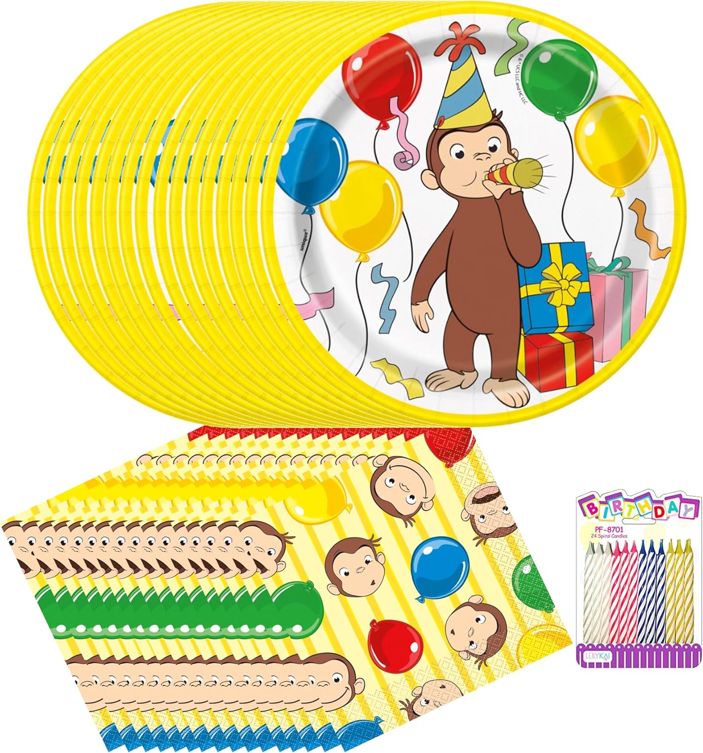 Complete Curious George Party Pack: Includes 7″ dessert plates, luncheon napkins, and 24 LLILYKAI birthday candles for up to 16 guests.