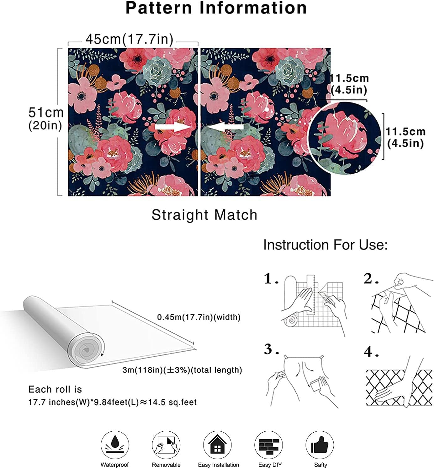 【PATTERN REPEAT】H20″ x W17.7″ (H51cm x W45cm), straight Match. First to find the correct pattern repeat and then just directly match without overlap, it’s very easy for beginner who never did peel and stick wallpaper before.