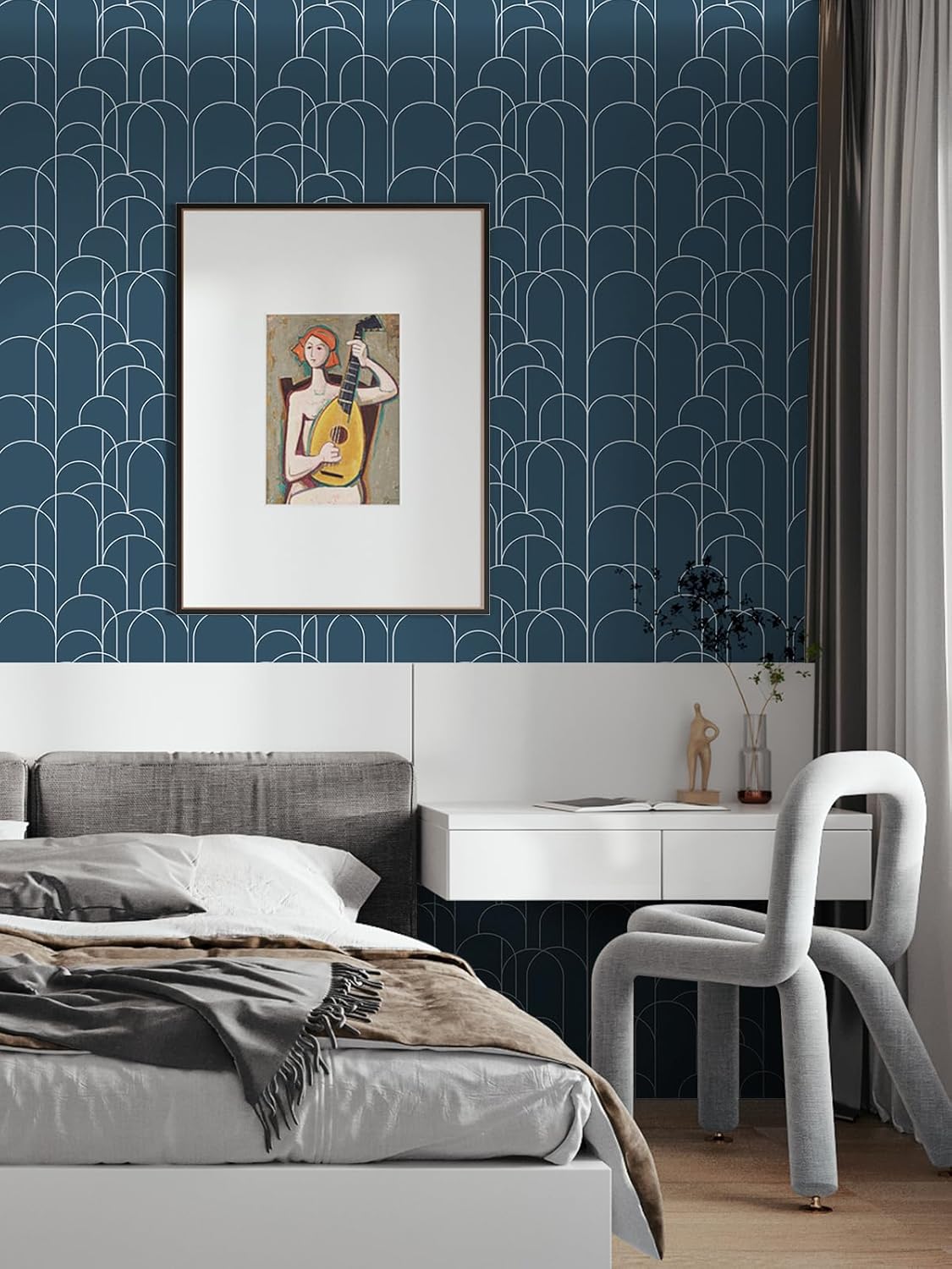 【Creative Design】: Our geometric peel and stick wallpaper, using simple white lines on the blue wallpaper outline layers of mountains, designed a unique geometric wallpaper style, make your room more spatial sense. The side white line is thick, used to press the edge, without matching, to add a pleasant atmosphere to your home