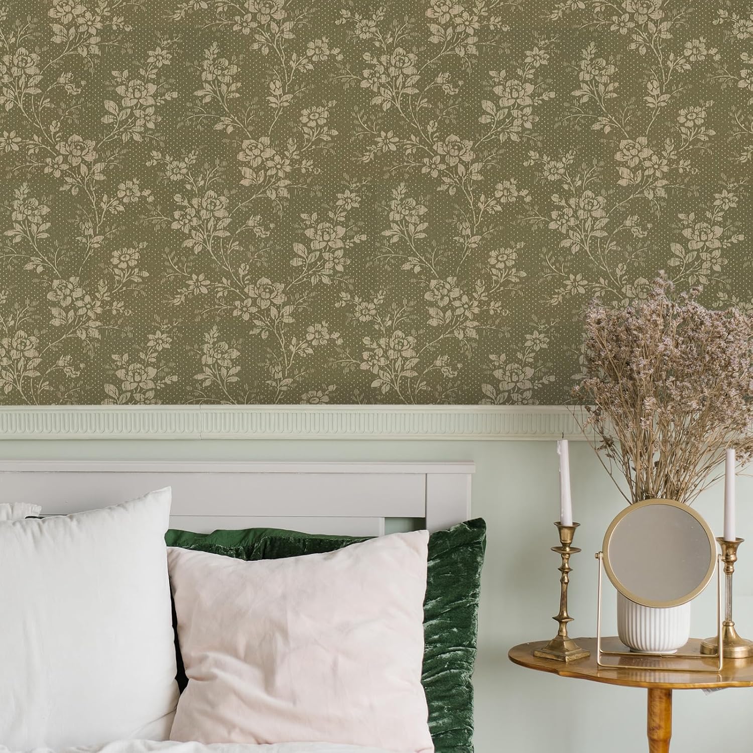 Vintage Green Floral Theme: the floral wallpaper features a flat pattern with no texture and has a reed green background sprinkled with milky white flowers and green leaf vines adorned with small round dots; This design can match a variety of styles