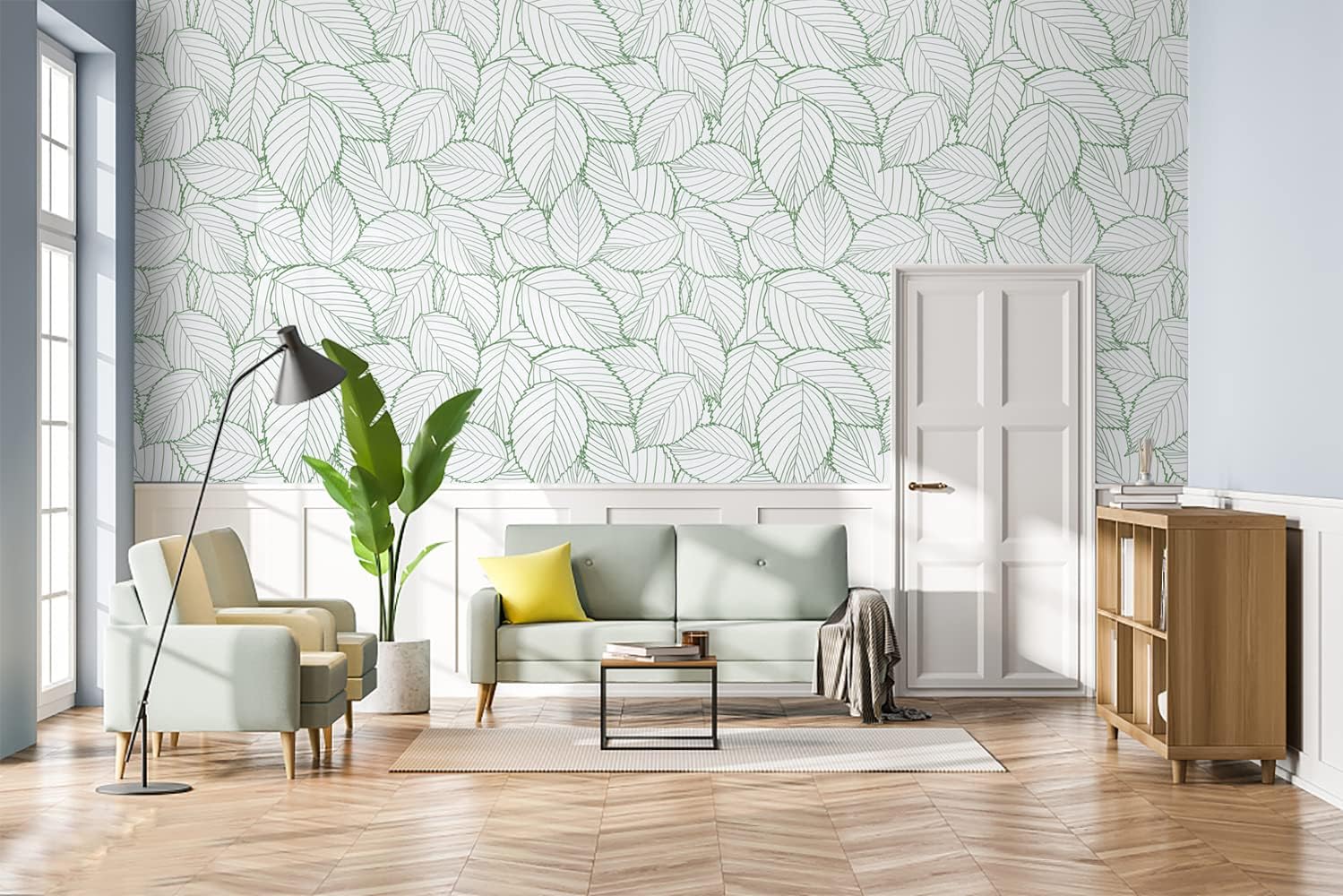 Modern Green Leaf Wallpaper Design: Modern green leaf wallpaper has a white background, simple, clean, bright, and decorated with large green leaves. Modern green leaf wallpaper will make your home full of life and make you feel relaxed and happy. This is the best choice for your home decoration. you feel relaxed and happy
