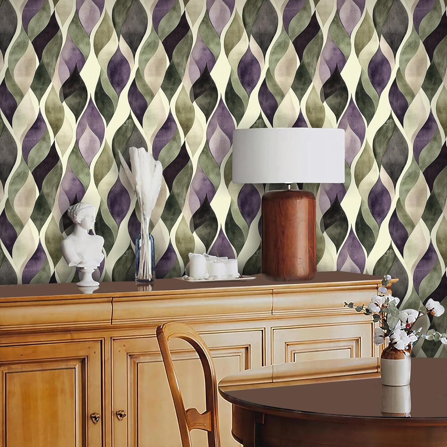 Modern Purple Wallpaper – This wallpaper features an abstract design of flowing, curved shapes in shades of deep purple, green, and soft beige. The watercolor-style pattern creates a soothing, fluid motion, blending rich tones with softer hues. The modern, artistic design is perfect for adding a sophisticated, yet tranquil vibe to living rooms, bedrooms, or home offices, offering a bold yet calming aesthetic.