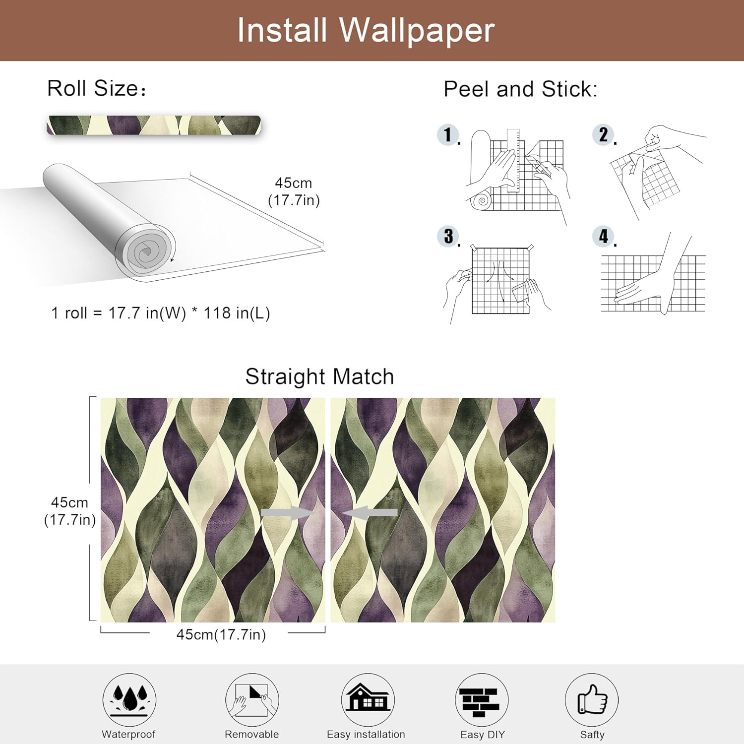 Size & Material – Made from premium vinyl material with eco-friendly ink and advanced printing technology, this self-adhesive wallpaper is waterproof, durable, and tear-resistant. Each roll measures 17.7 × 118 inches, covering approximately 14.5 square feet. The pattern repeats every 17.7 × 17.7 inches.