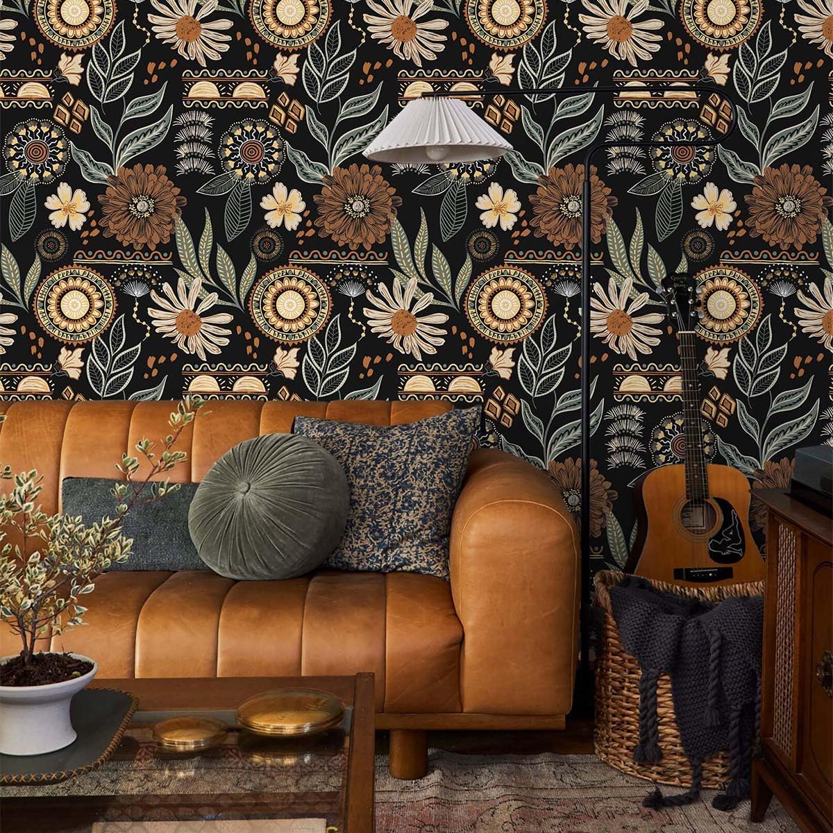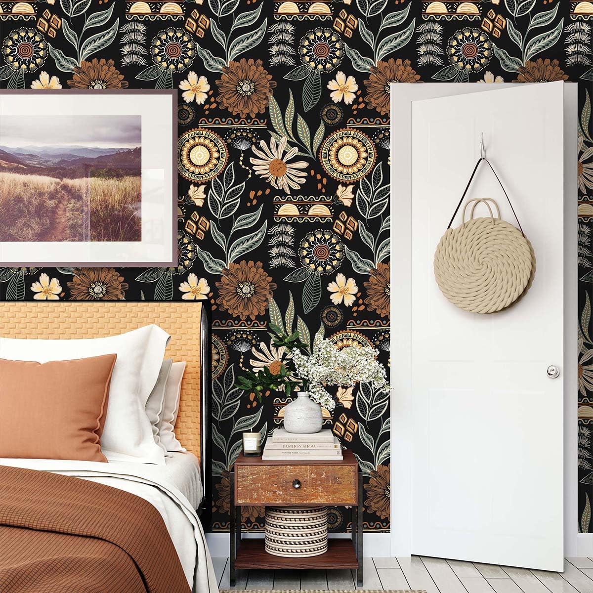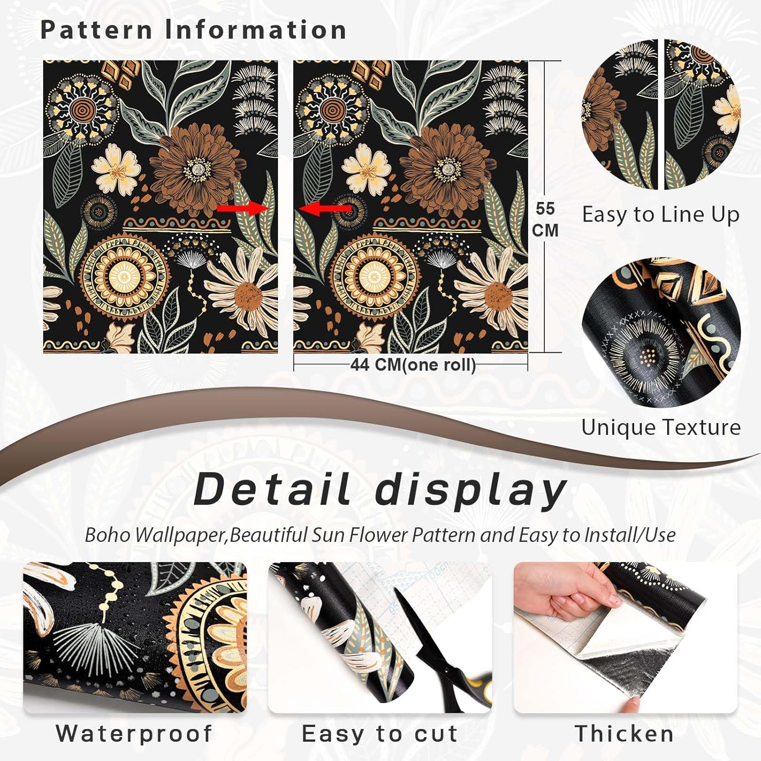 UNIQUE DESIGN: Matte surface texture design, The Boho-style wallpaper draws inspiration from a midnight garden. Featuring an earthy color palette, blooming sunflowers, and intertwining leaf vines, it blends the free-spirited vitality of bohemian aesthetics with the tranquil elegance of dark tones, infusing your home decor with both warmth and vibrancy