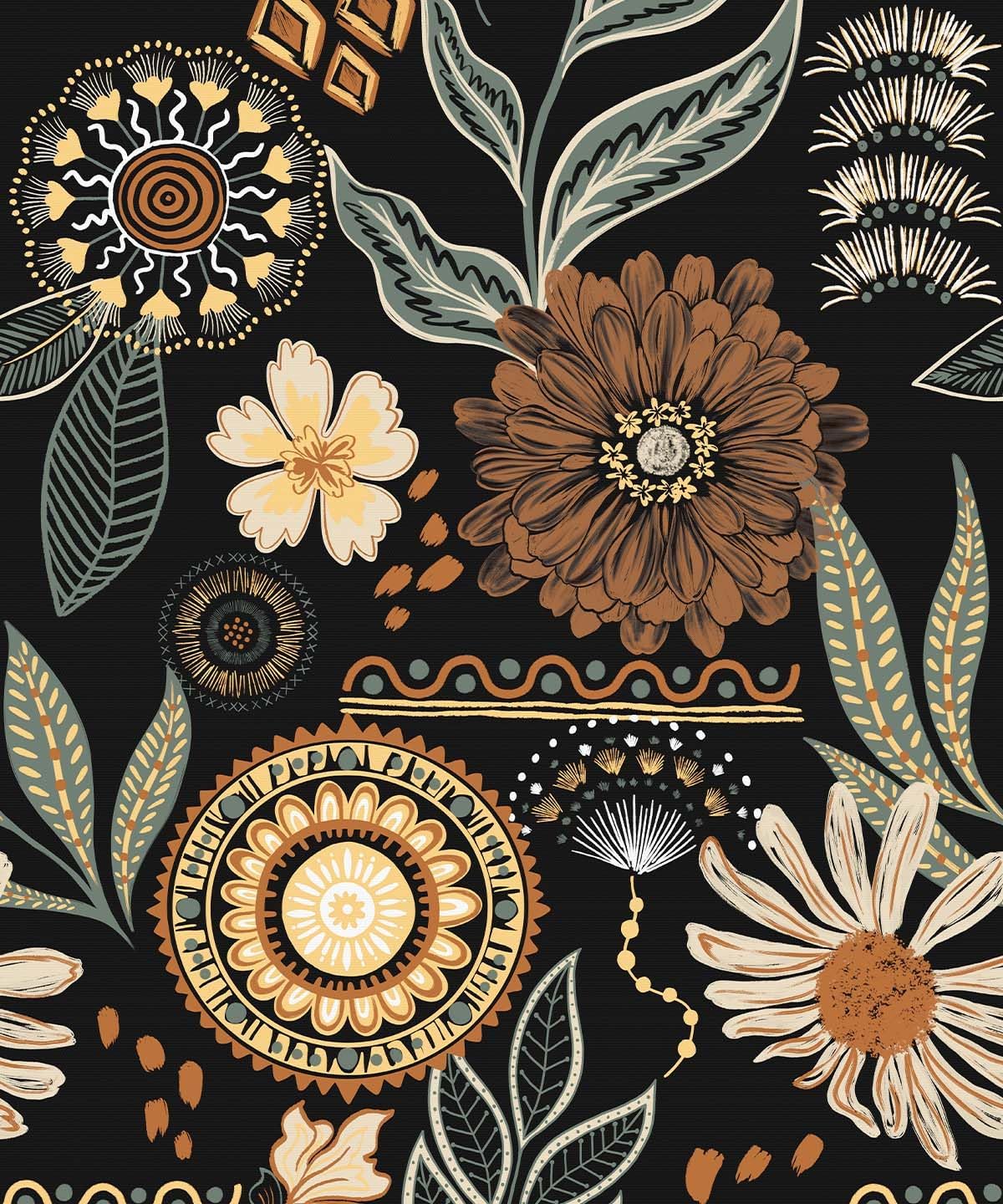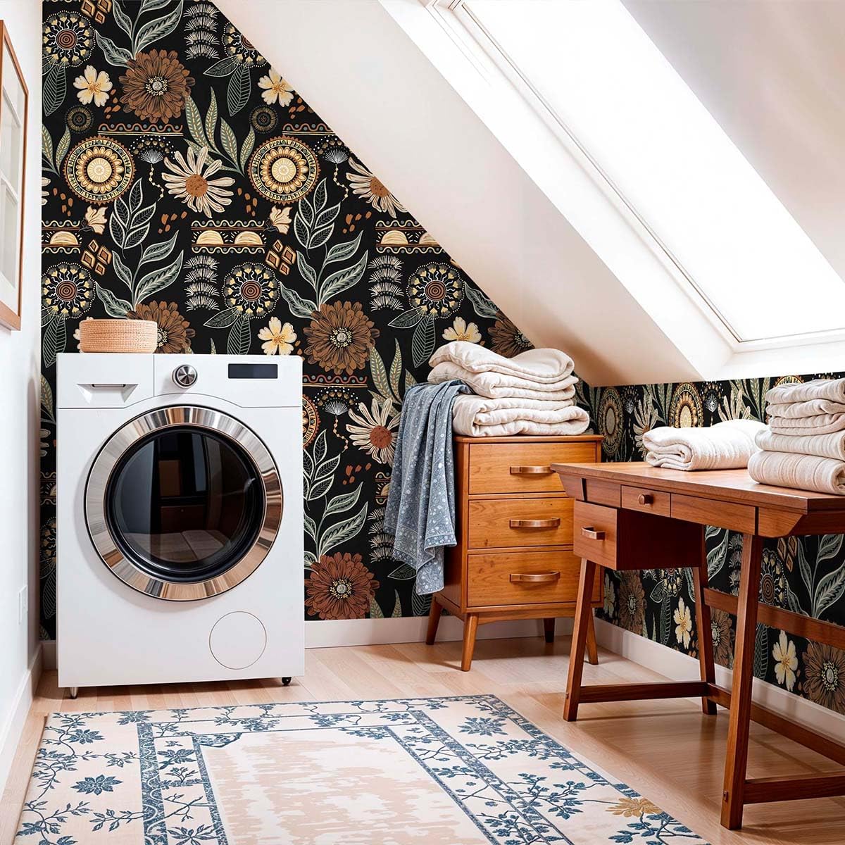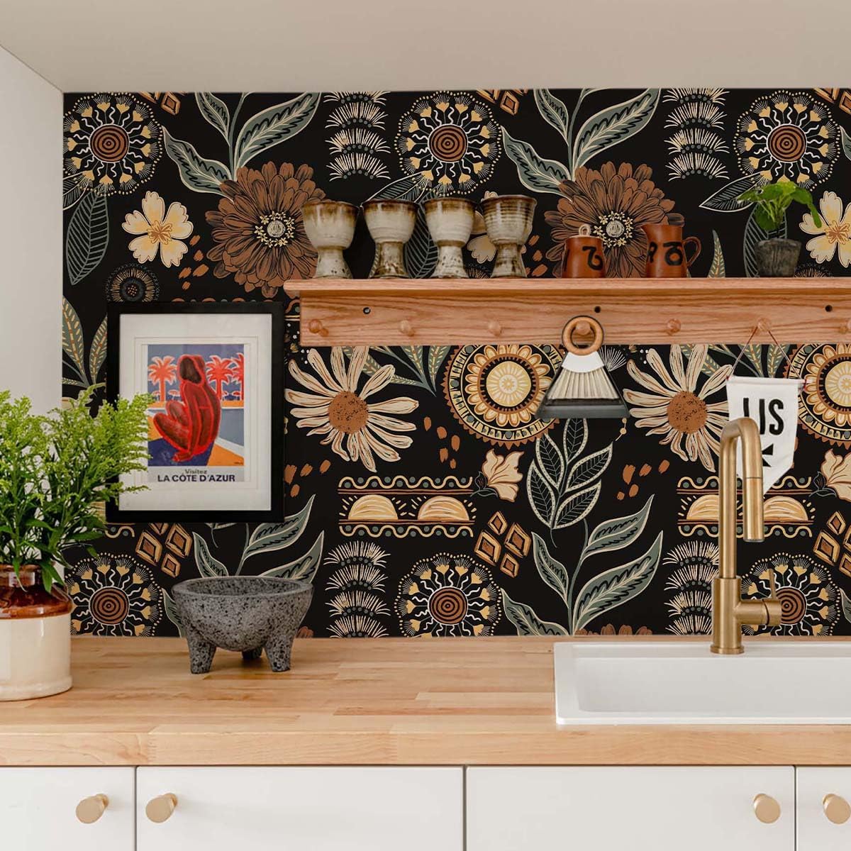 UNIQUE DESIGN: Matte surface texture design, The Boho-style wallpaper draws inspiration from a midnight garden. Featuring an earthy color palette, blooming sunflowers, and intertwining leaf vines, it blends the free-spirited vitality of bohemian aesthetics with the tranquil elegance of dark tones, infusing your home decor with both warmth and vibrancy