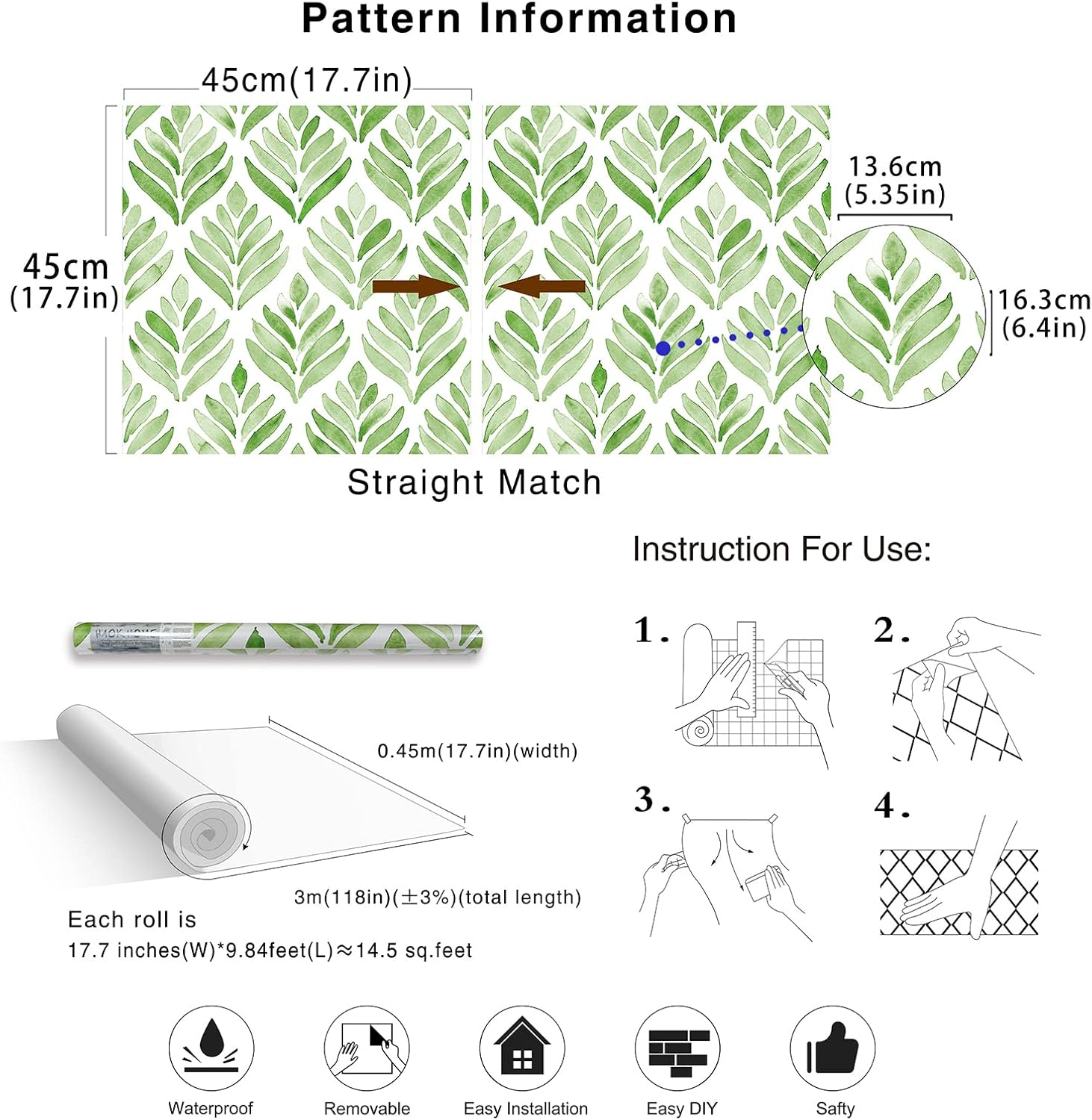 PATTERN REPEAT: H17.7″ x W17.7″ (H45cm x W45cm), straight Match. First to find the correct pattern repeat and then just directly match without overlap, it’s very easy for beginner who never did peel and stick wallpaper before.