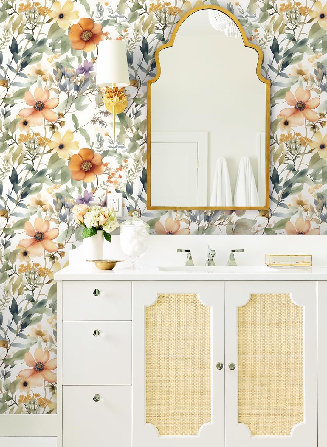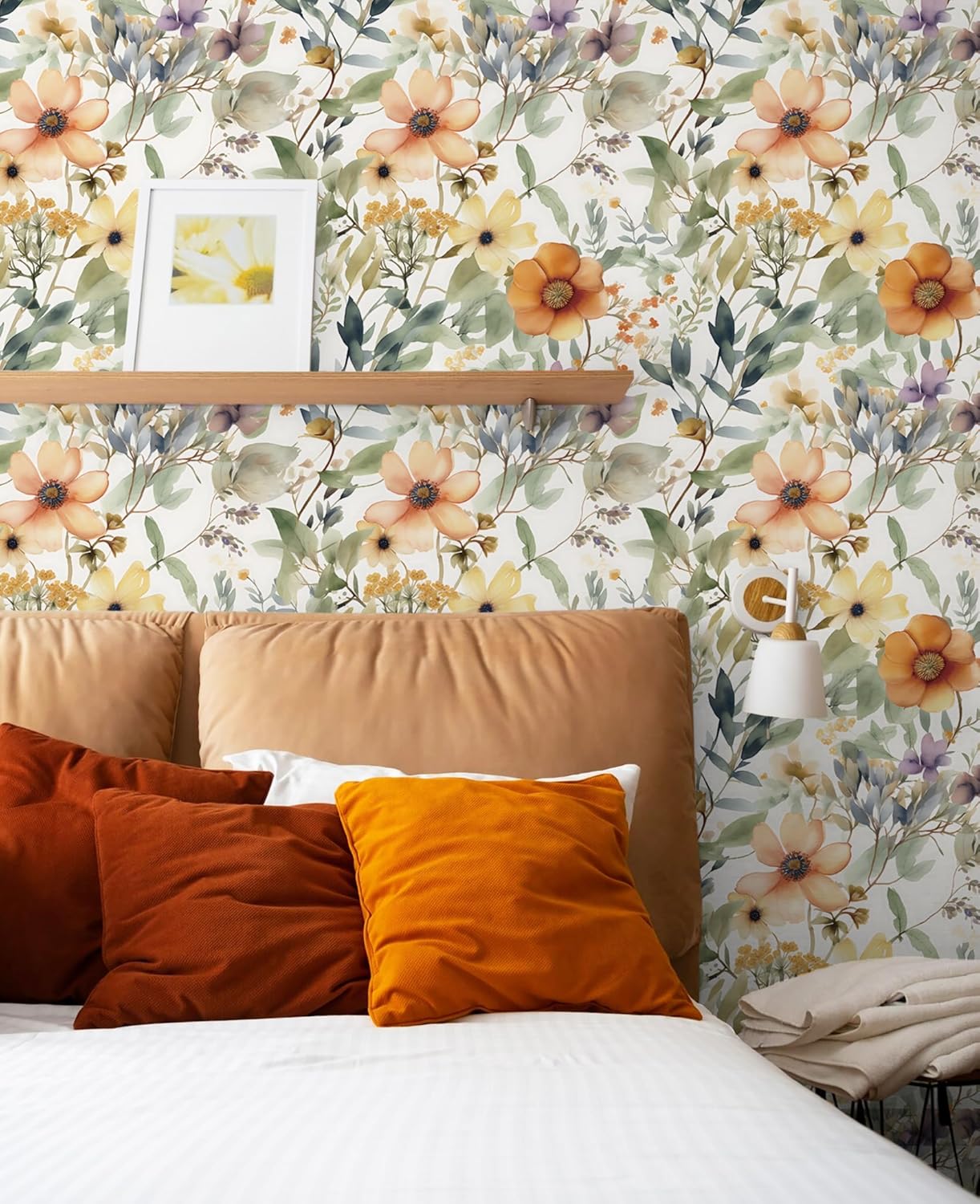 【DESIGN】: The boho wallpaper with vibrant color scheme. Use warm orange and yellow colors to outline a variety of wash flowers. Outline the leaves with different shades of green. The orange-yellow flowers are large and vivid, scattered, and look beautiful and not dense on the wall