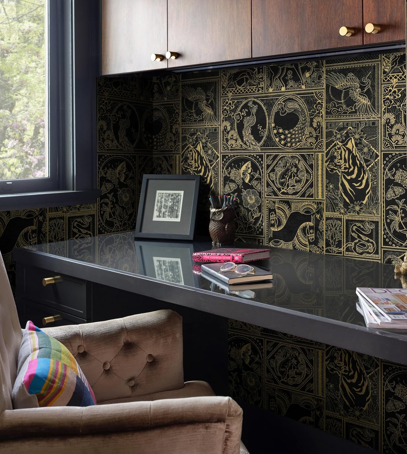 Product Design:The composition of the wallpaper pattern is made up of multiple different panels, each with a different animal design, demonstrating a harmonious blend of animal motifs, decorations and textures. While the black and gold color scheme adds visual depth and contrast, intricate patterns such as tigers, peacocks, horses and flowers further enhance the visual appeal, creating a visually stunning and engaging space