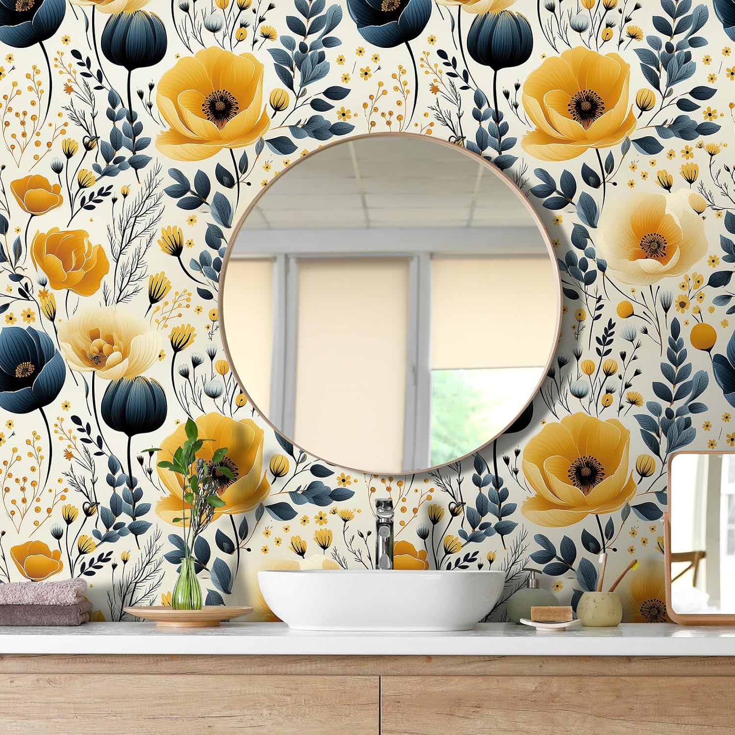 Livelynine Floral Wallpaper Peel and Stick Vintage Wildflower Navy Blue and Yellow Garden Floral Wall Paper Self Adhesive 17.5×78.8 Fall Poppy Flower Contact Paper for Cabinets Drawers Shelf Liner