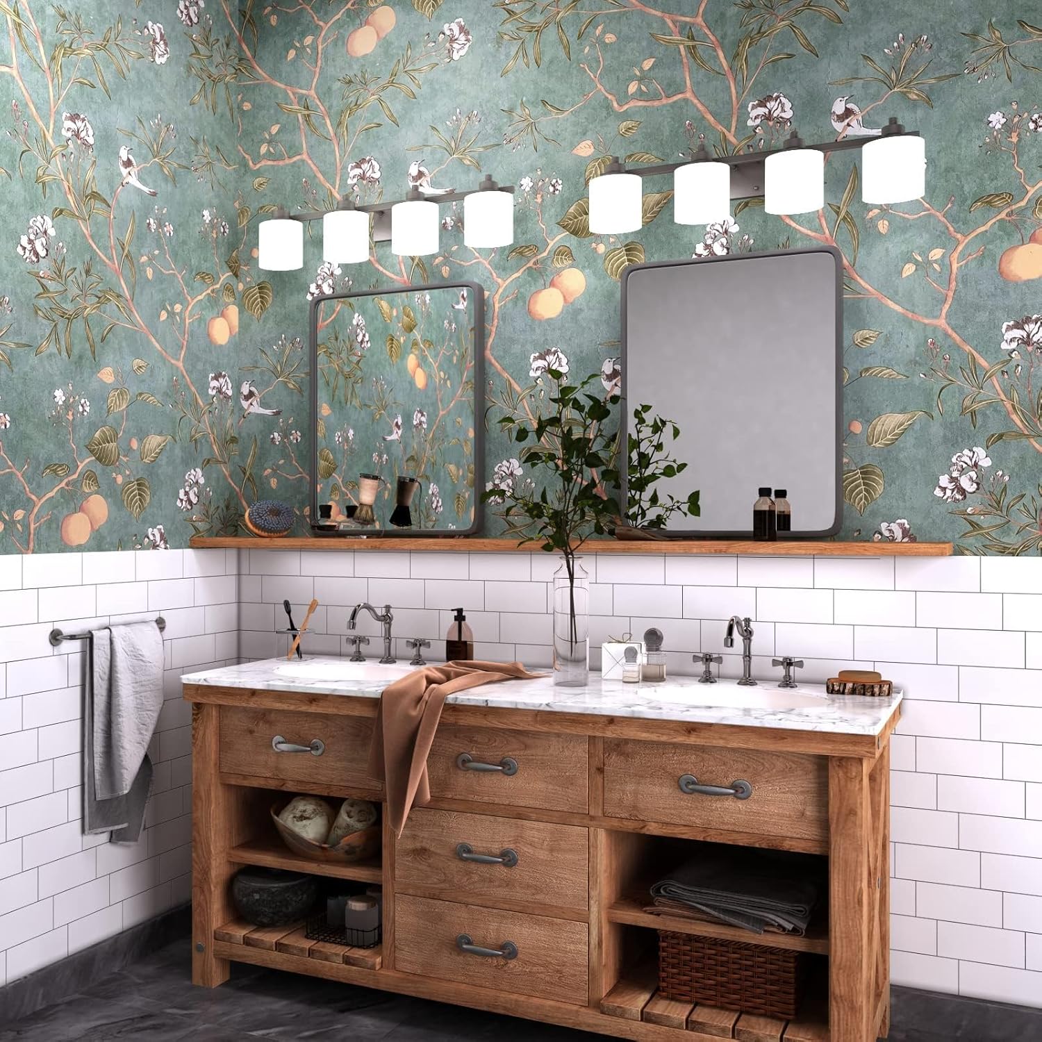 【Flower Splice】Vintage flower and bird wallpaper adopts off soft green as background and is decorated with flowers, birds, leaves, fruit and branches. The leaf pattern can be perfectly spliced. Try to move them up and down the alignment points when sewing. This farmhouse wallpaper is peel and stick and matches most home designs, striving to create a wallpaper that truly reflects the beauty and vitality of nature to enjoy peaceful and freshness.