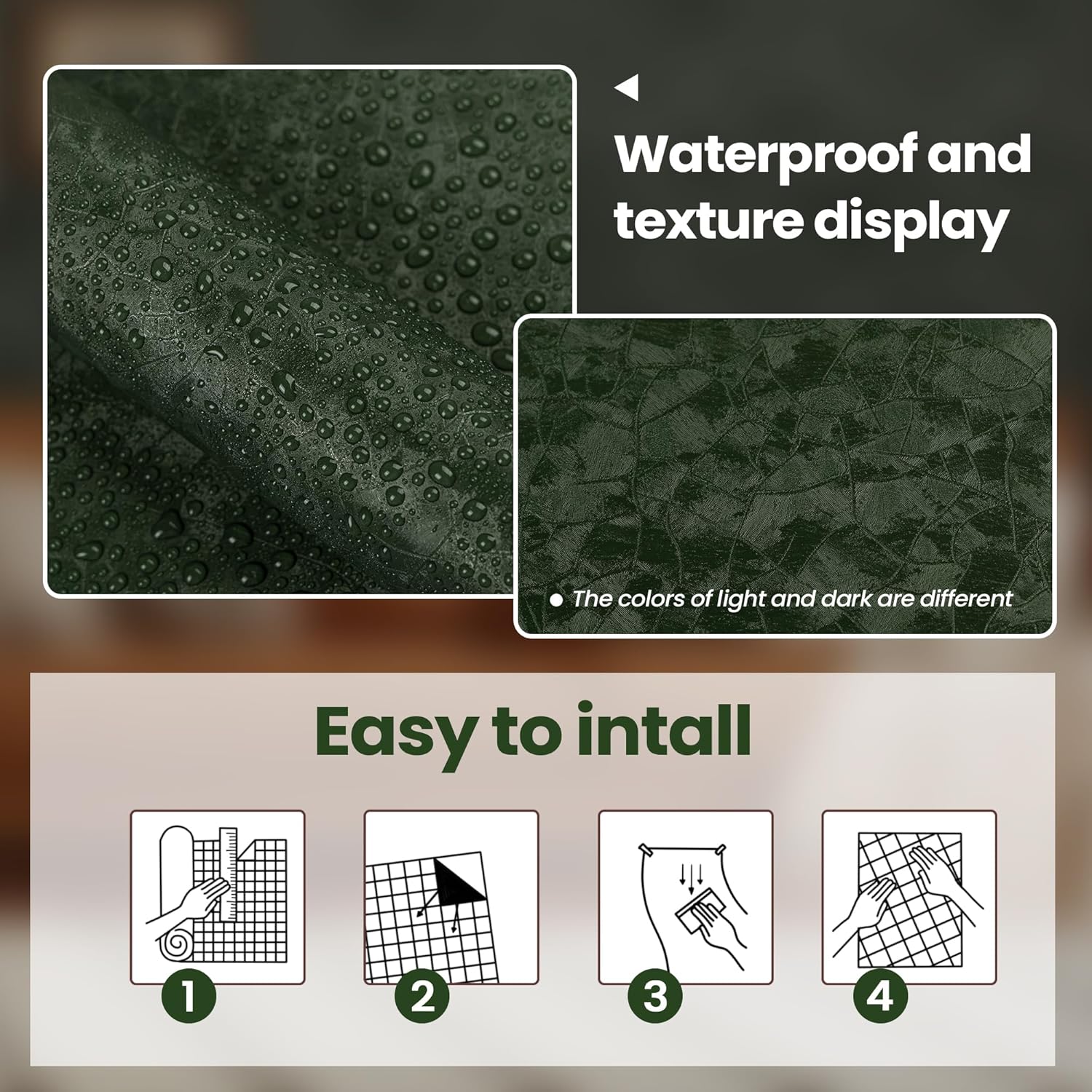 Unique Appearance Design: The surface of the dark green wallpaper adopts a unique 3D embossing process, and the color varies under different lighting conditions. It is black in the dark areas and green in the sun or bright light. Direct matching, no overlap, and a simple and quick new look for walls or furniture