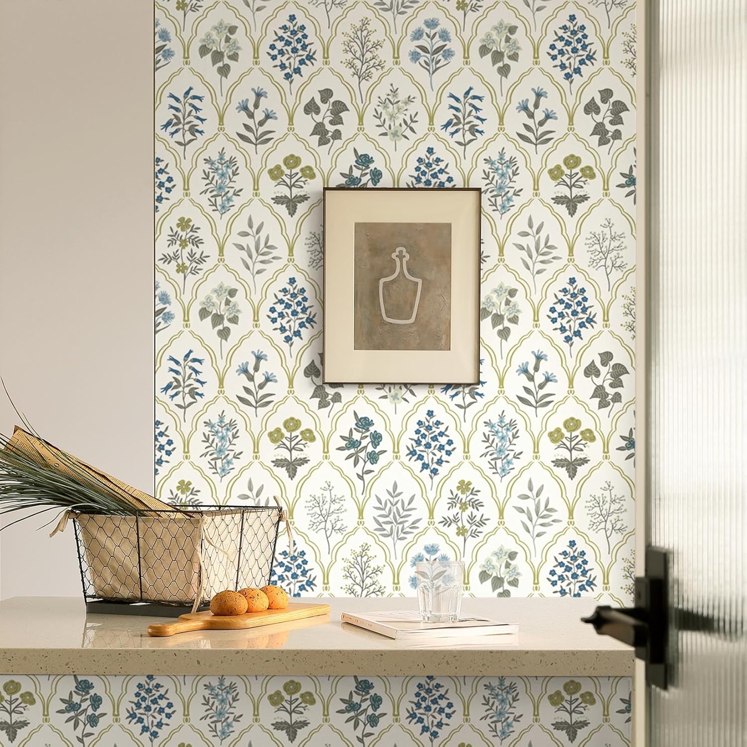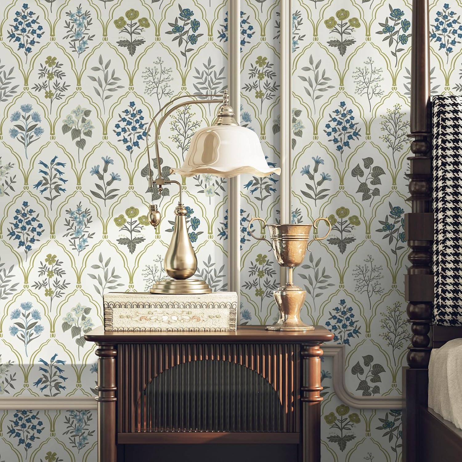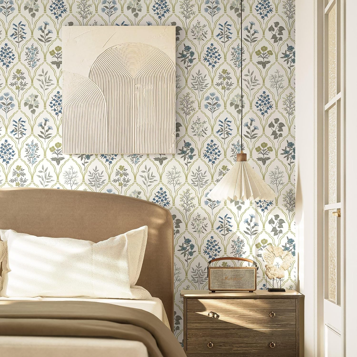 Dimoon 78.7″x17.3″ Peel and Stick Wallpaper Contact Paper Floral Modern Removable Wallpaper Beige Wall Paper Self Adhesive Boho Contactpaper for Cabinets Drawers Blue Vintage Bedroom Thicken Vinyl