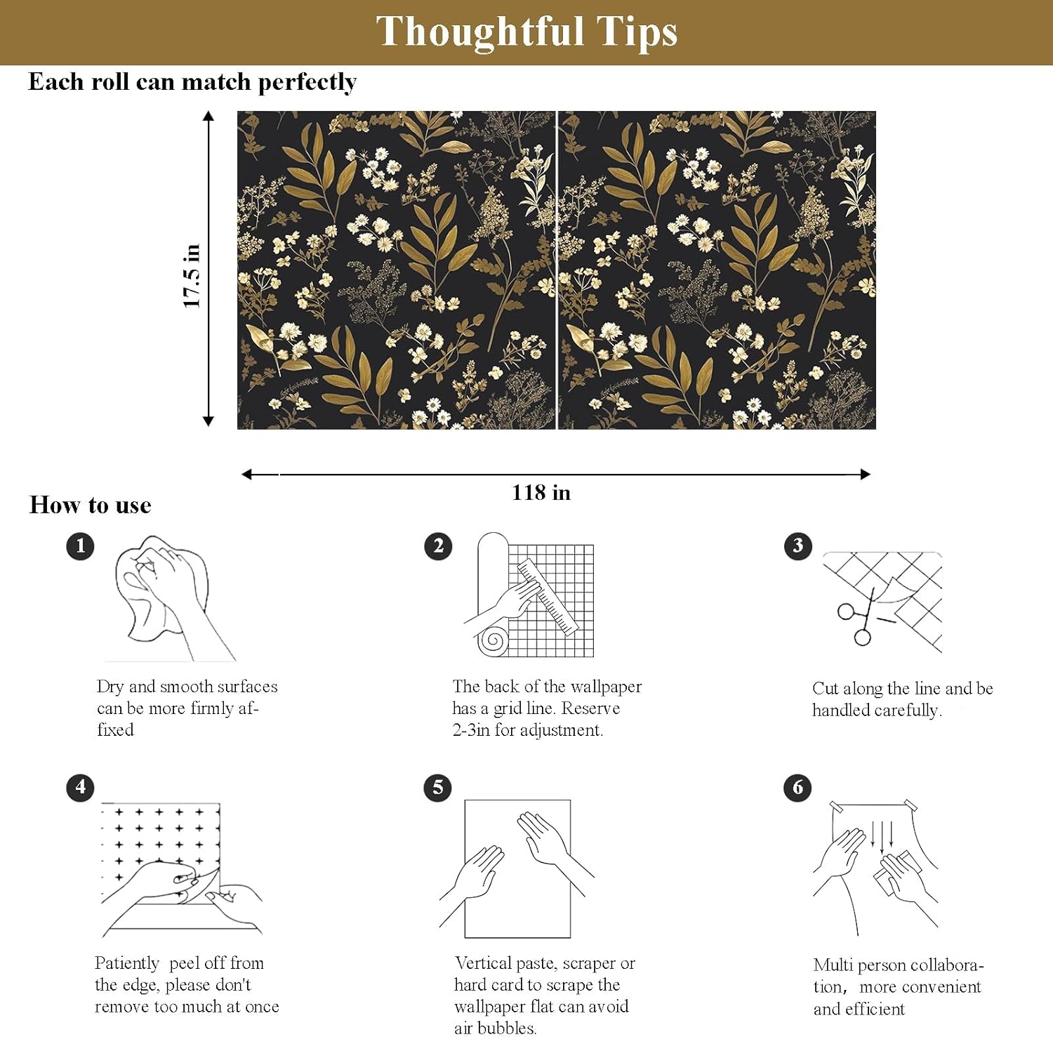 【ROLL OF WALLPAPER】Each roll of wallpaper measures 17.5in x 118in, covers 14.5 square feet.Black floral pattern wallpaper,vinyl,removable,waterproof,self-adhesive.Please buy enough rolls at a time to ensure they are from the same batch to avoid color differences