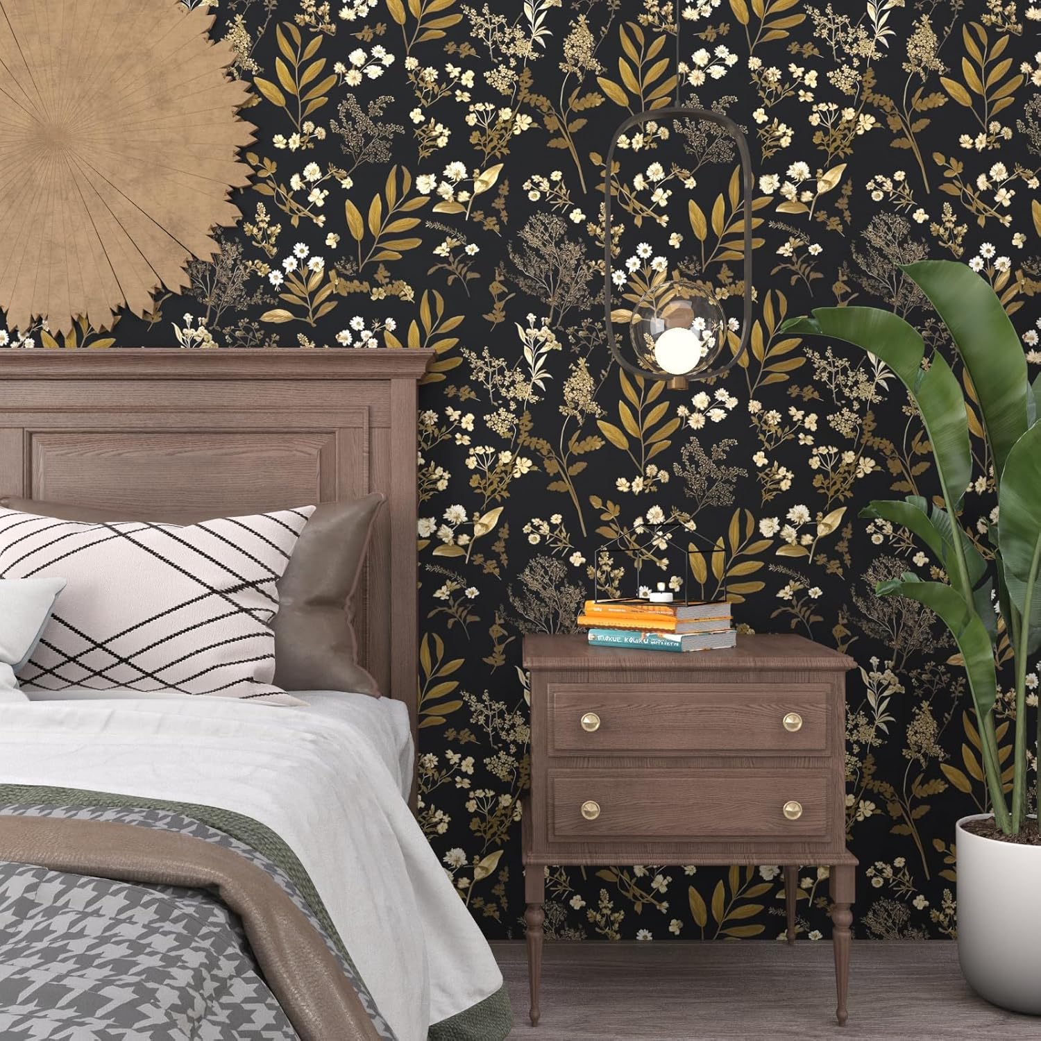 Black Gold Wallpaper Peel and Stick Dark Floral Wallpaper 17.5in x 118in Vintage Leaf Contact Paper Vinyl Waterproof Self Adhesive Boho Botanical Wall Paper for Bedroom Cabinet Décor
