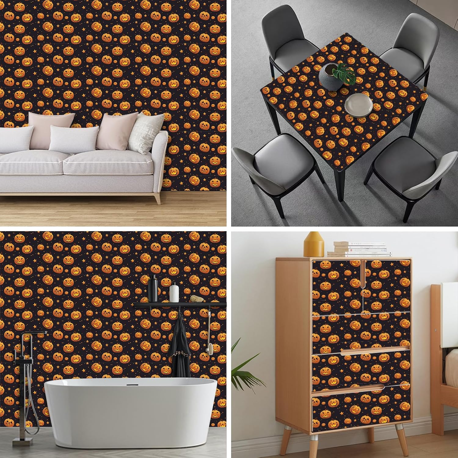 Material Features: Made of self adhesive vinyl, this contact paper features repeating pumpkin jack o lanterns on a black background. The decorative wall covering creates a festive Halloween atmosphere.